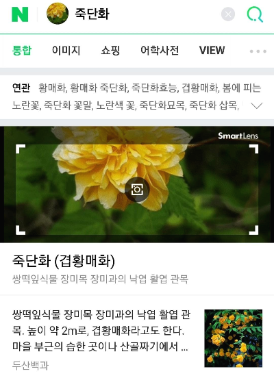 잠시 기다리고 있으면 네이버 스마트 렌즈는 [아래 사진]과 같이 "황매화"라는 검색 결과를 신통방통하게 보여줍니다.