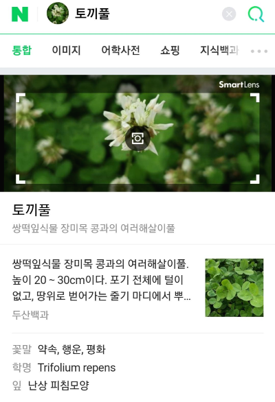 길 가다가 스마트 렌즈로 "토끼풀" 검색했더니 아래와 같은 식물이름을 알려줍니다.