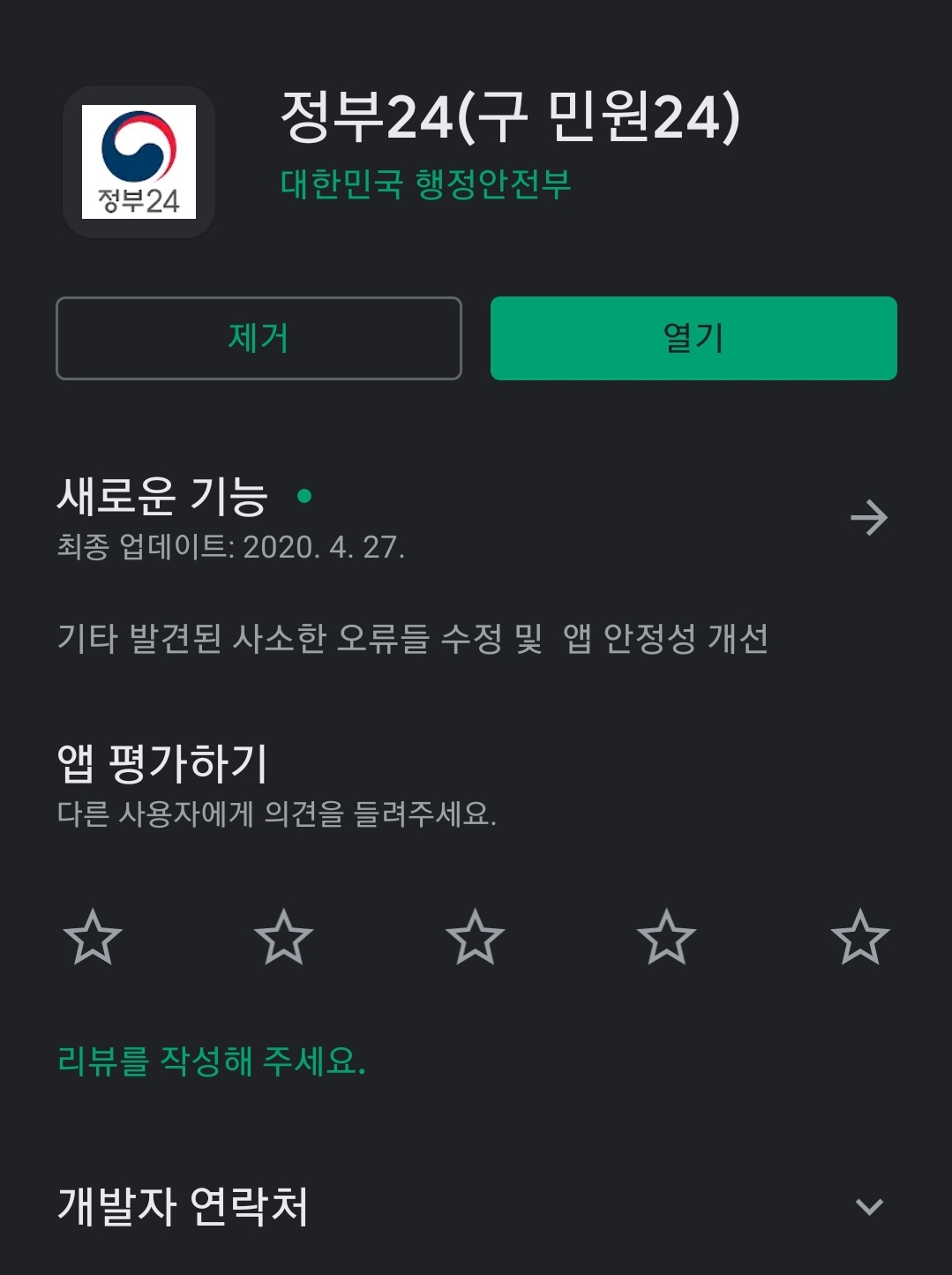 안드로이드 앱 스토어인 "플레이스토어"에는 "정부24" 앱에 대해 "정부의 서비스, 민원, 정책정보를 통합 제공하는 대한민국 정부 대표 포털입니다."라고 소개하고 있습니다.