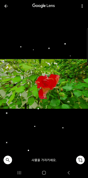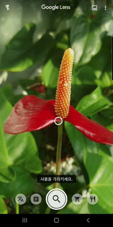 앱을 실행하면 [아래 사진]과 같이 카메라기능이 실행되는데요. 스마트폰을 궁금한 식물에 갖다대고 [아래사진]에 표시된 곳중에 한곳을 누르면 끝입니다.
