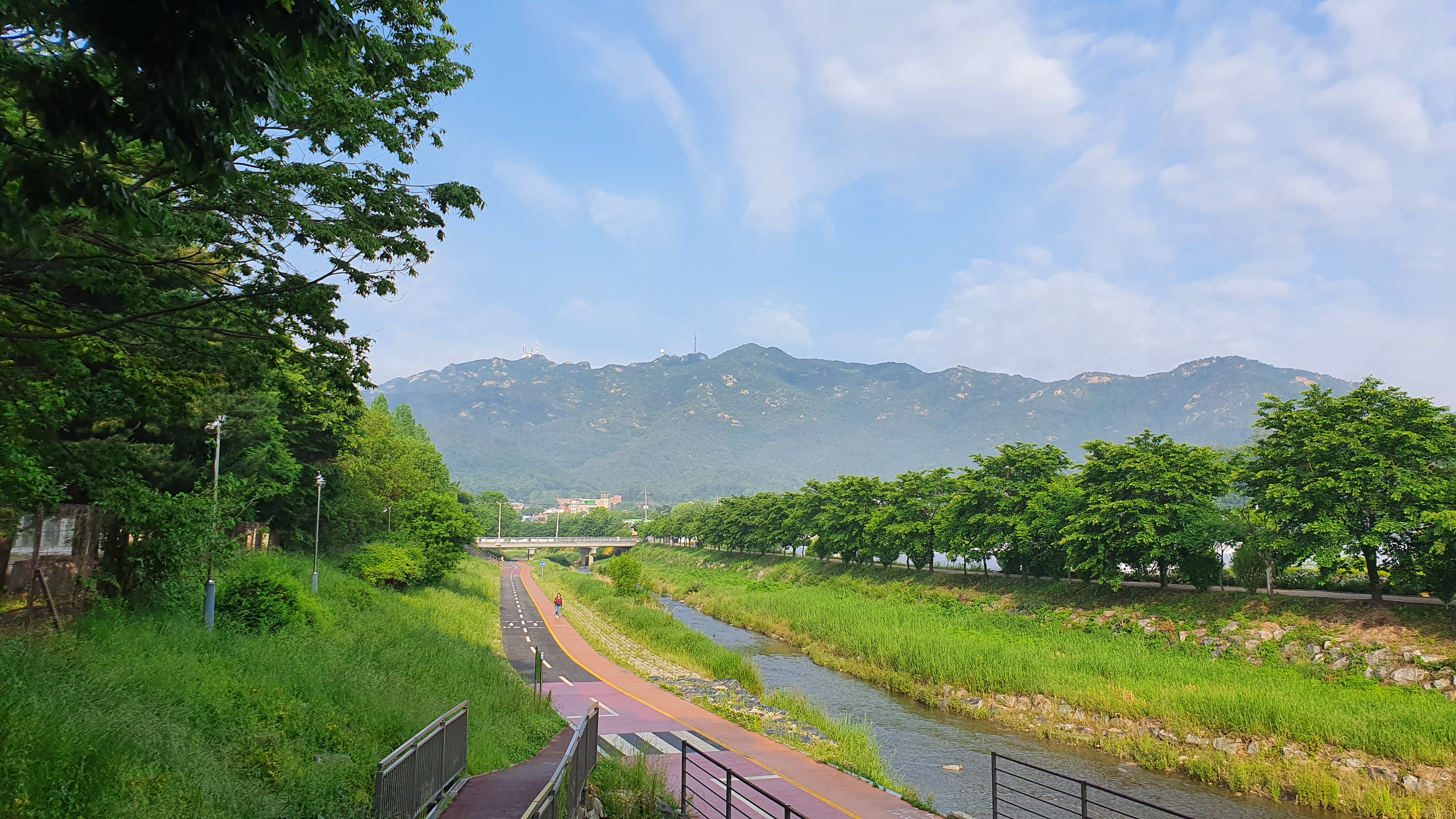 지하철 4호선 선바위역 6번 출구에서 대공원로를 따라 약 100m 정도 걷다 보면 양재천으로 진입하는 길이 나오는데요. [아래 사진]이 그 길목에서 촬영한 양재천 (관악산 방향) 전경입니다. 사진에서 저 뒤로 보이는 거대 능선은 관악산입니다.