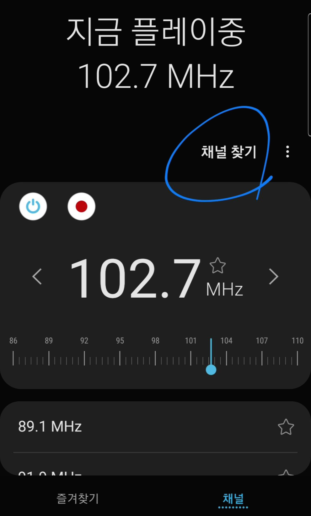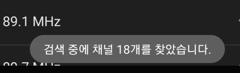 라디오가 켜졌으니 이제 "채널 찾기"해야지요. 저는 9호선 여의도역(고속터미널 방향)에 플랫폼에서 채널 찾기를 [아래 사진]과 같이 실행했습니다.