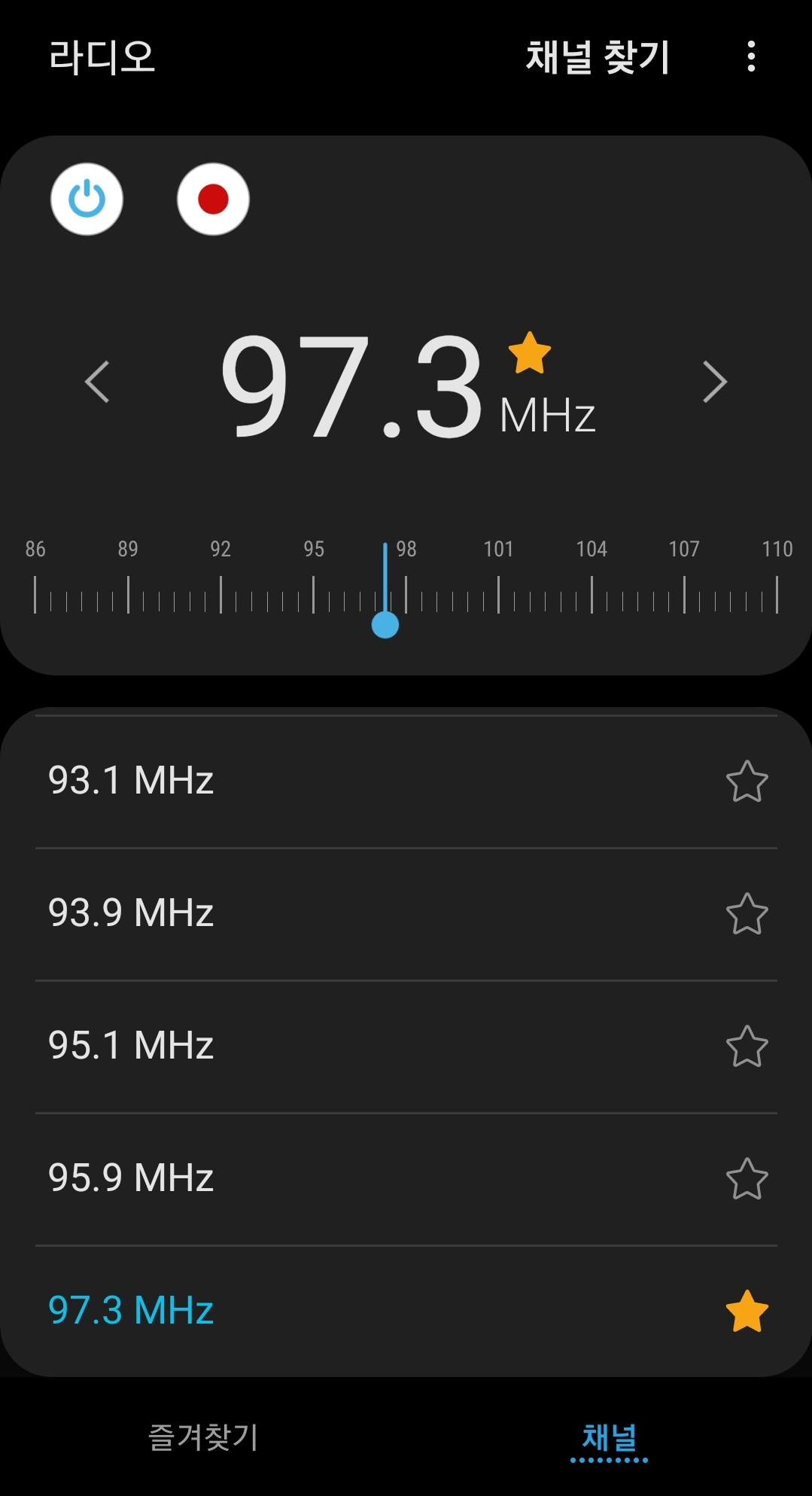 채널 찾기를 완료했으면 좋아하는 지상파 FM 라디오 방송 채널을 즐겨찾기 합니다. 저는 97.3 Mhz KBS 1 라디오를 즐겨찾기 했습니다. 나중에 [아래 사진]에서 젤 하단에 있는 즐겨찾기 카테고리에서 듣고자 하는 라디오 채널을 선택해서 들으시면 됩니다.