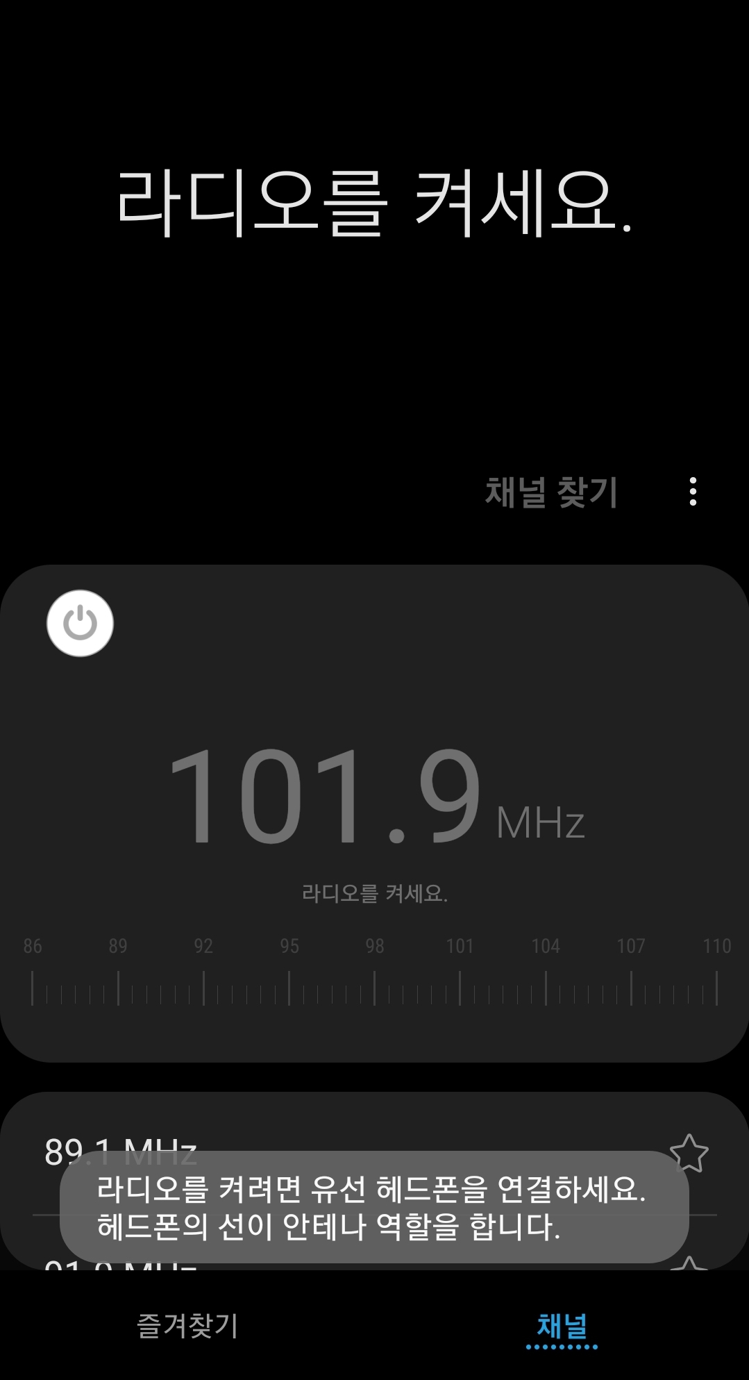 저는 이어폰을 소지하고 있기에 스마트폰 헤드폰 단자에 이어폰을 연결하고 라디오을 켭니다. 그러면 [아래 사진]과 같이 전원 버튼이 활성화되면서 라디오가 켜집니다.