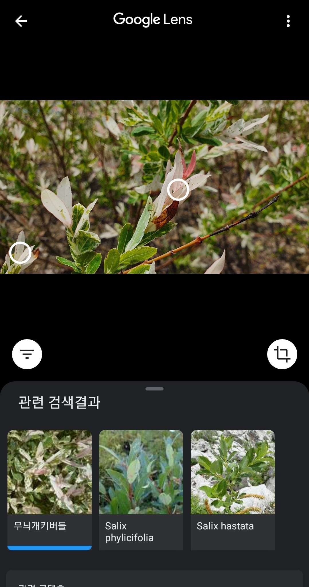 꽃 이름과 식물이름 알려주는 앱 구글 렌즈를 실행하고 서울 식물원에서 촬영한 근접 사진을 업로드합니다. 그러면 잠시라는 표현이 무색할 정도로 그냥 곧바로 [아래 사진]과 같이 상위에 "무늬개키버들" 등 3가지를 알려주더군요. 서울식물원에서 말하는 개키버들과 일치합니다.
