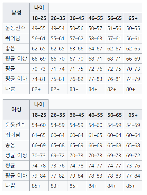 "평균 심박수를 나이와 연관이 있다."라고 하는데요. 나이별 휴식기 심박수는 [아래 표]와 같으니 참고하시기 바랍니다.
