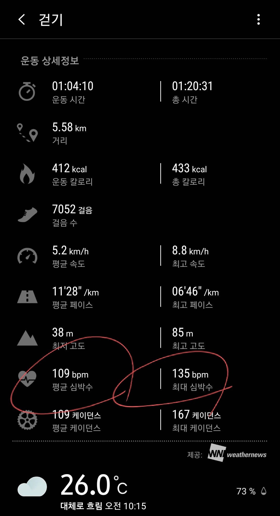 더운 여름날 1시간 동안 걸어보니 평균 심박수 109, 최대 심박수 135가 측정됐다.