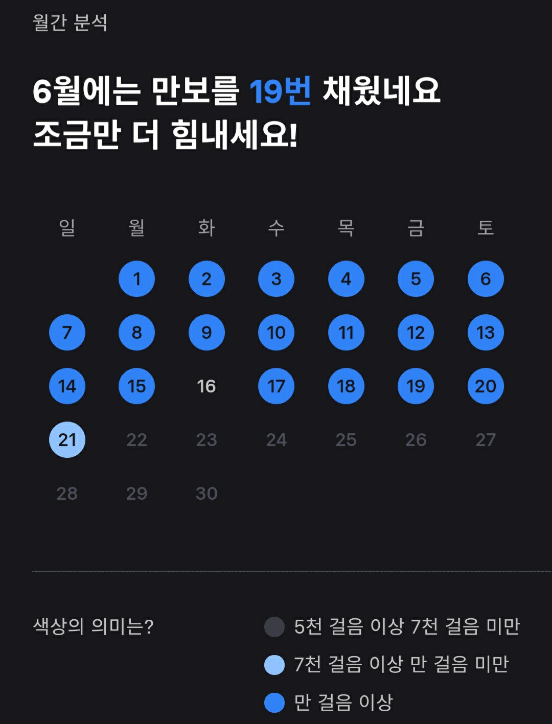 사실 저는 몇년전부터 하루 1만보를 생활화하고 있습니다. 그래서 어떠한 일이 있어도 1만보를 채우려고 노력하고 있지요. 그 덕분에 6월 21일 현재 토스 만보기에서는 "19번 만보를 19번 채웠네요. 조금만 더 힘내세요!"라고 분석해주고 있습니다.