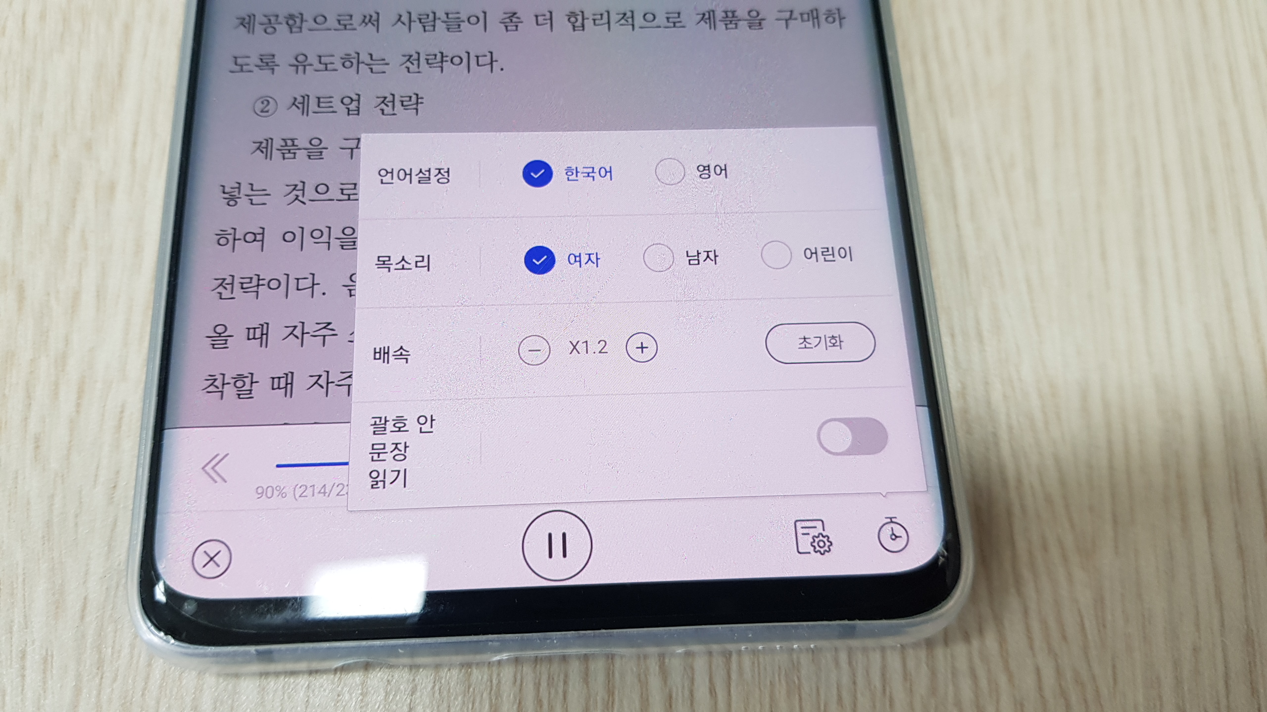 책 읽어주는 앱 교보문구 전자도서관은 언어설정, 목소리, 배속, 괄호안문자읽기 등 몇가지 설정값이 있어요. 저는 한국어, 여자, 배속은 1.2배, 괄호안문장읽기는 off 했습니다. 참고로 책읽어주는 속도는 1.2배가 가장 적합하더군요. 때론 이해가 잘 가지 않은 내용이면 속도를 늦춰 듣는답니다.