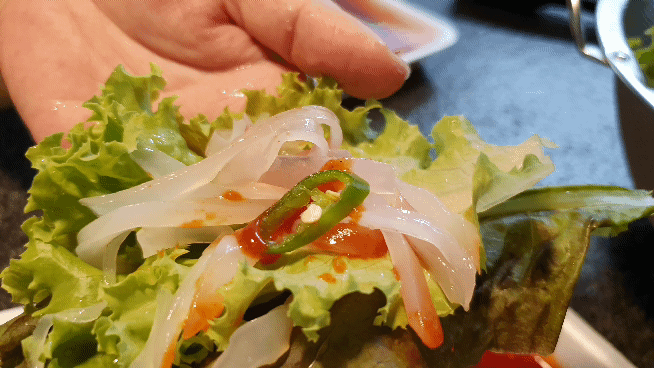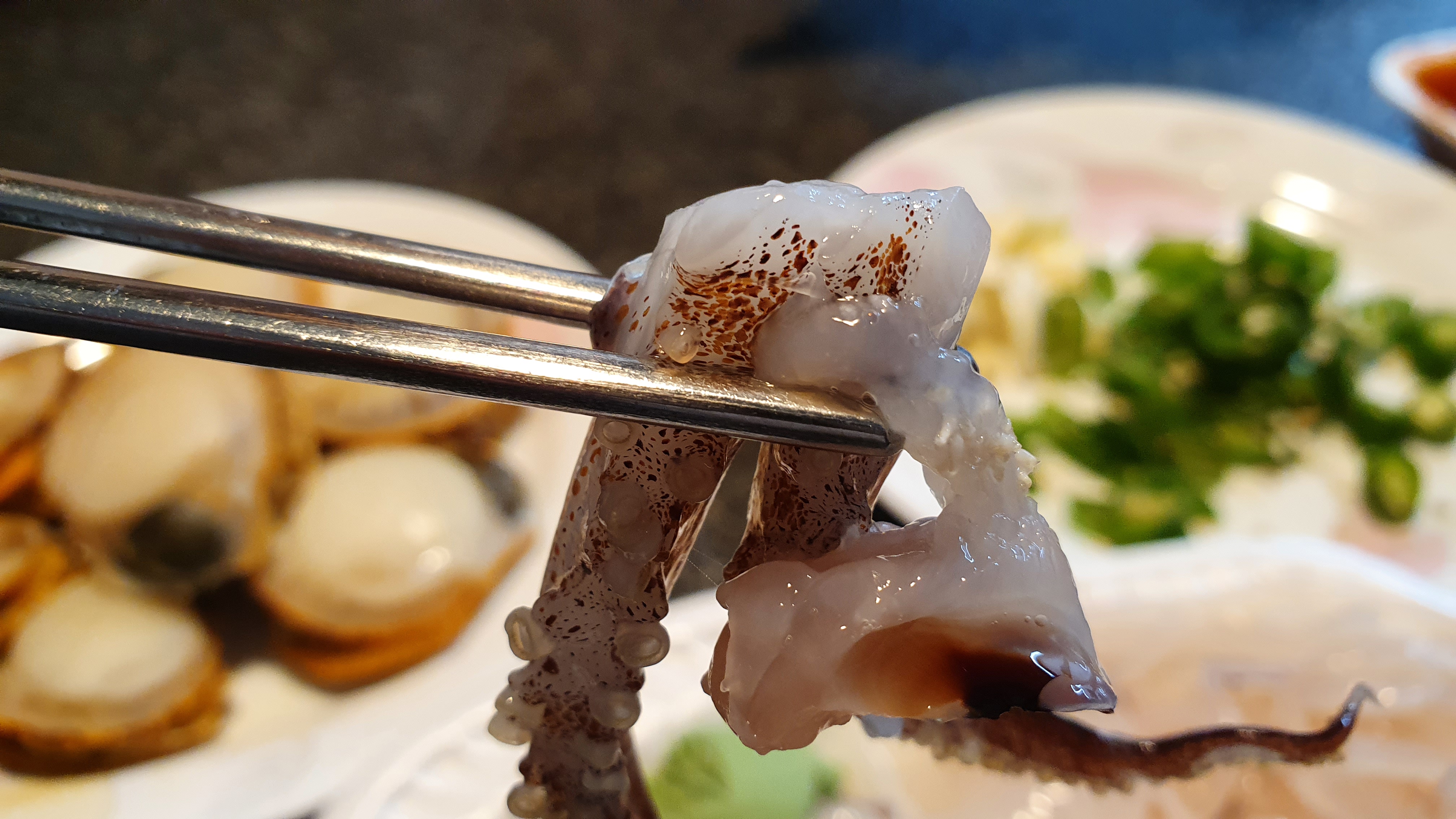상추나 깻잎 위에 오징어 몸통, 다리, 초고추장, 청양고추, 마늘을 놓고 쌈 해서 그것을 입에 넣고 씹습니다. 이쪽저쪽에서 터지는 초고추장과 마늘, 고추의 매운맛 그리고 잘근잘근 다리, 물컹물컹 몸통 맛이 어우러진 식감은 탄성이 절로 납니다.