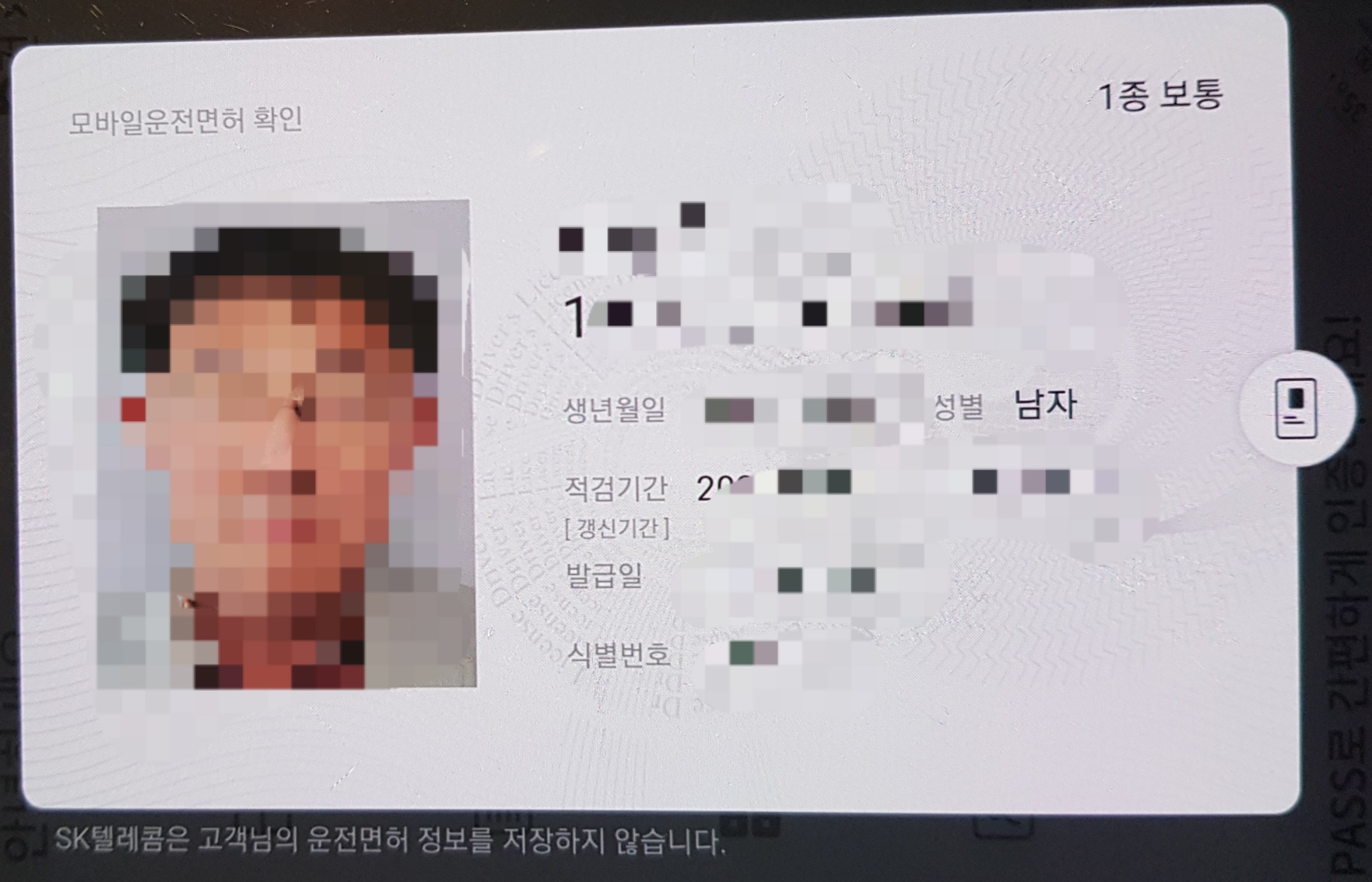 위 모바일 운전면허증에서 하단 원을 클릭하면 [아래 사진]과 같이 운전면허증의 세부내용이 나옵니다. 모양이 기존 플라스틱 운전면허증과 거의 유사합니다. "SK텔레콤은 고객님의 운전면허 정보를 저장하지 않습니다."라는 메시지가 보이네요.