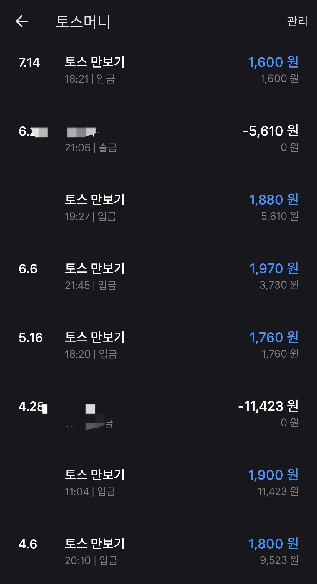 [아래 사진]은 걷기 여행하면서 토스 만보기로 벌어들인 최근 수입 현황입니다. 100원씩 모은 현금을 한 번씩 목돈(?)을 통스 송금으로 인출해서 아메리카노 마십니다. ㅋㅋㅋ