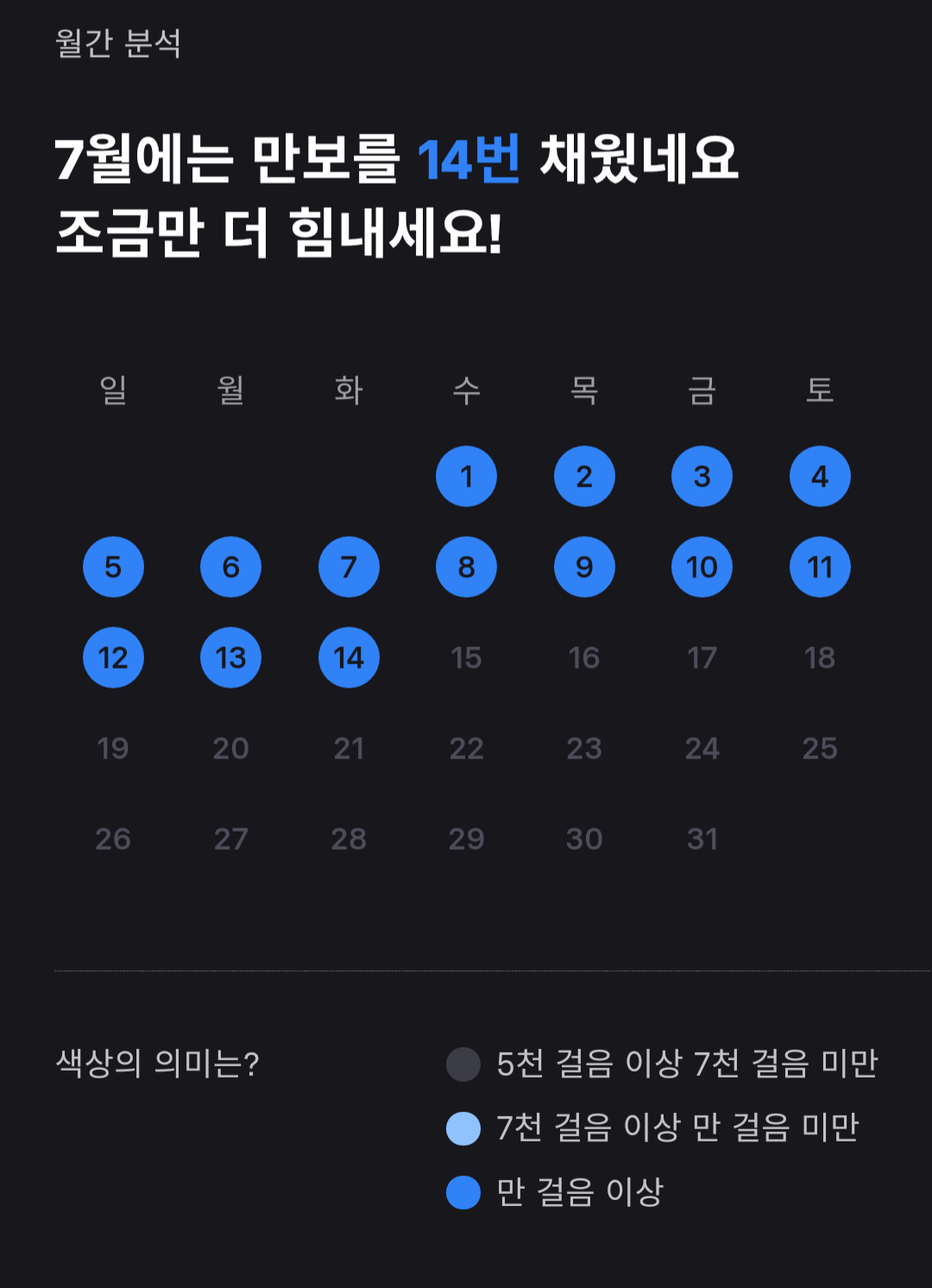 토스 만보기는 [아래사진]과 같이 "7월에는 만보를 14번 채웠네요. 조금만 더 힘내세요!"라고 하는 월간 분석을 해줍니다. 오늘이 15일이니까 아직까지 하루도 빠짐없이 걷기 여행 1만보는 계속되고 있습니다.