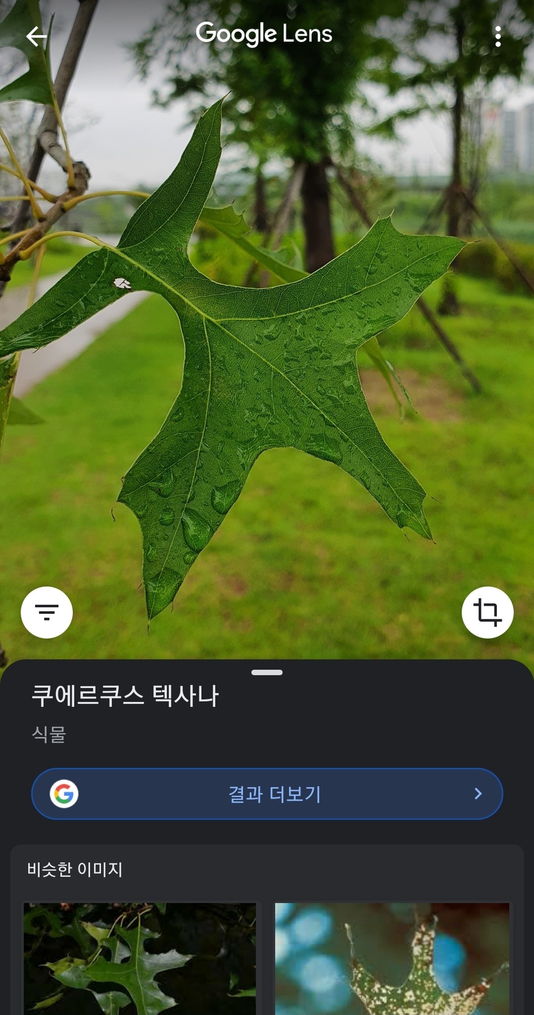구글렌즈에게도 네이버와 다음에게 제시했던 나뭇잎 사진을 주고 물었습니다. 결과는 [아래사진]과 같이 "쿠에르쿠스 텍사나"라고 하면서 이미지는 가장 비슷한 결과물을 알려주네요.