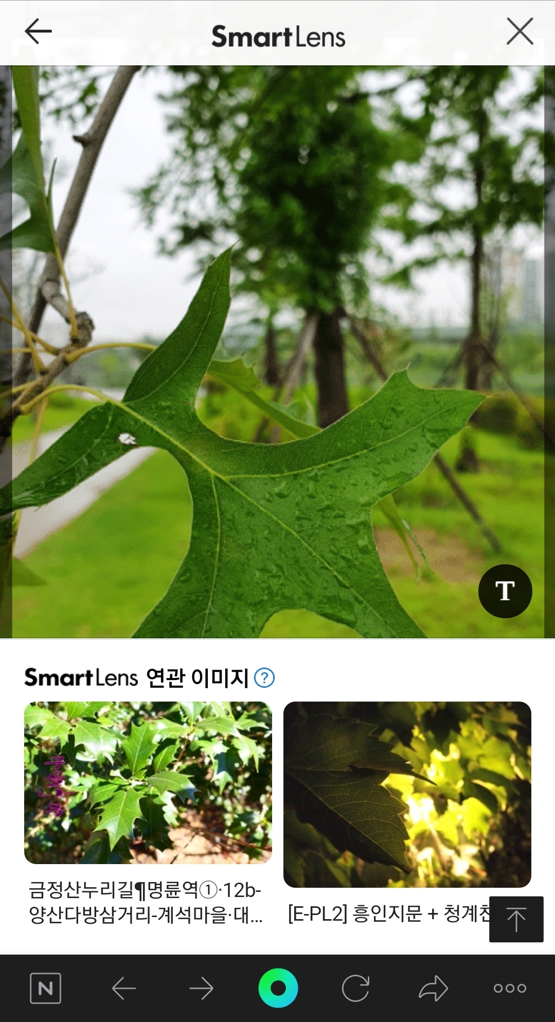 먼저, 위 나뭇잎 사진으로 네이버스마트렌즈에게 물어봤어요. 그랬더니 [아래 사진]과 같이 영 개운치 않은 검색 결과를 보여 주고 있습니다.