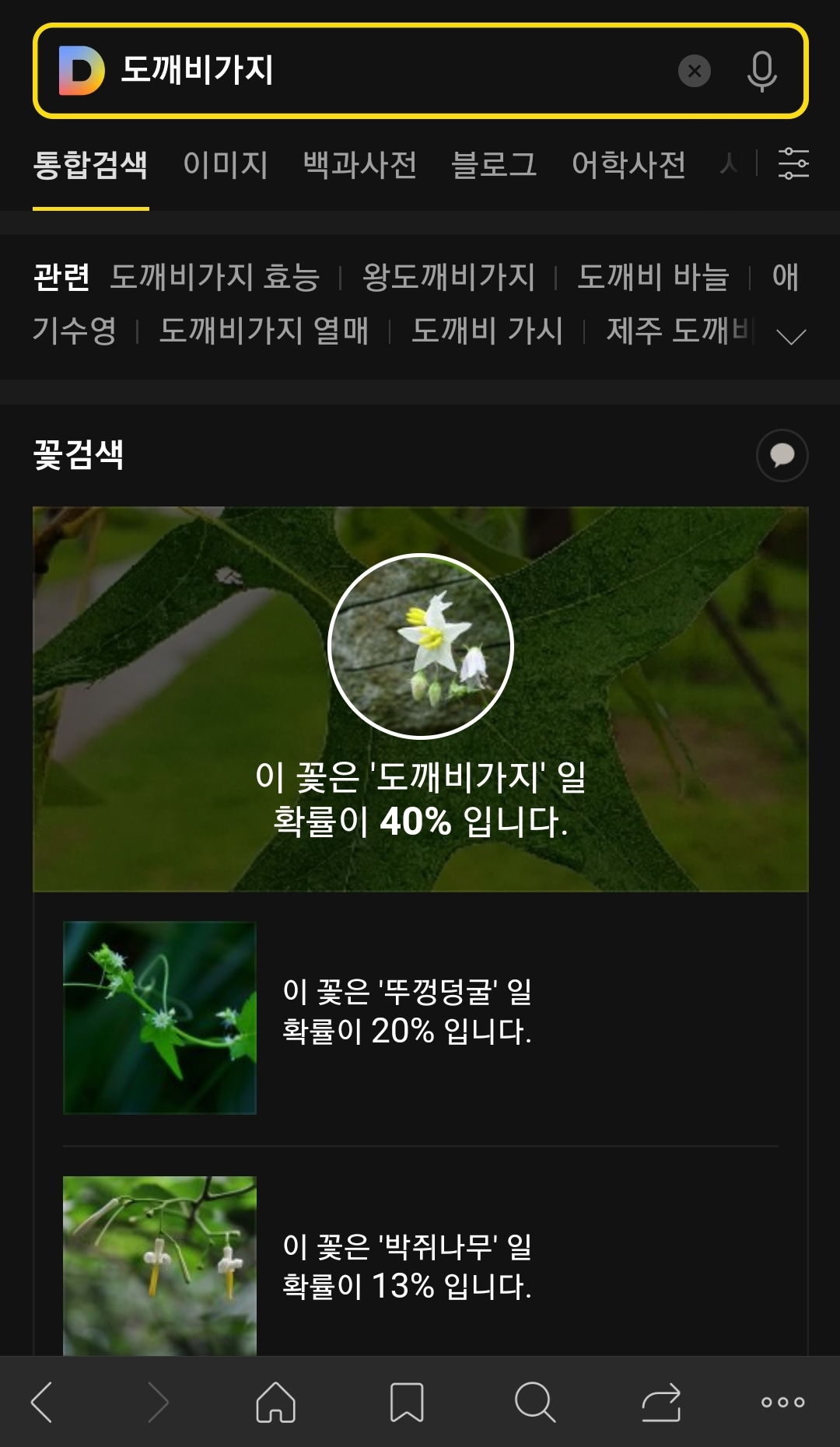 다음꽃검색에도 물어봤습니다. 이 꽃은 "도깨비가지"일 확률이 40%입니다."라고 알려주는데 정말 엉뚱합니다. 아마도 꽃이 아니라 그런지 오차 범위가 아주 넓어 보입니다.