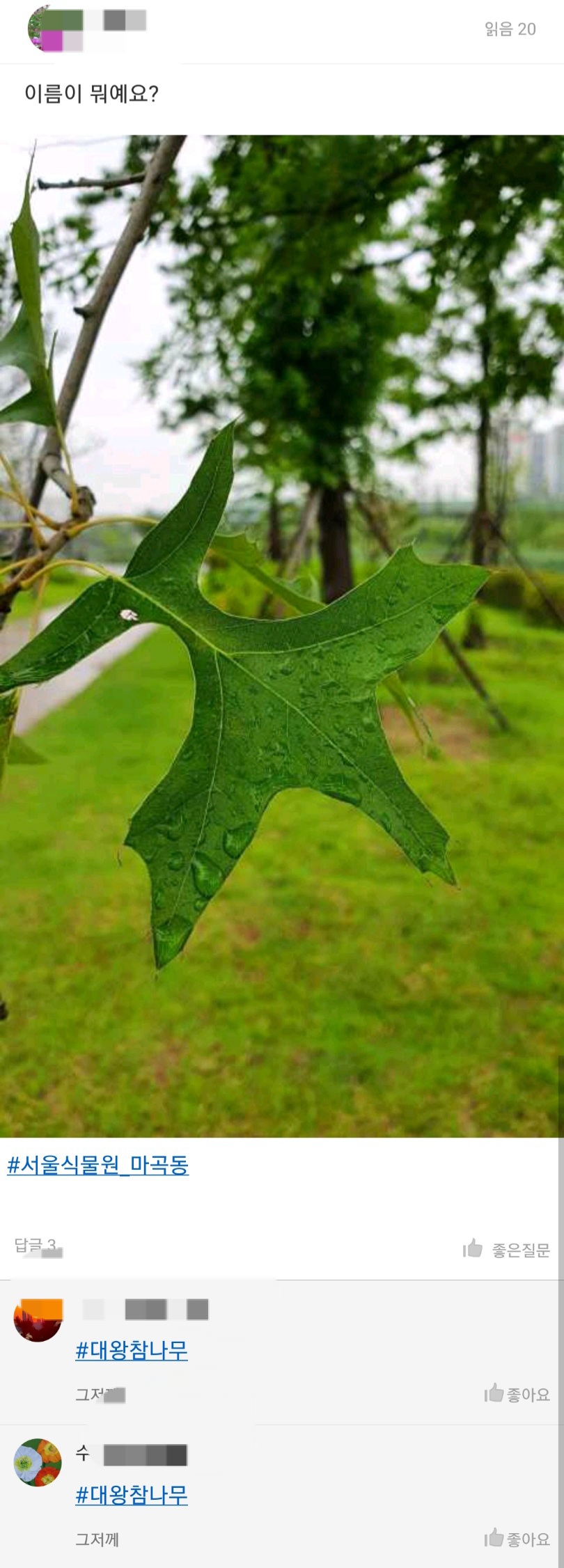 꽃과 식물이름 알려주는 네이버스마트렌즈, 구글렌즈, 다음꽃검색에서 원하는 검색결과를 얻지 못해 저는 마지막으로 개인적으로 가장 정확도가 높다고 평가하는 "모야모"에 질문했습니다. 사진을 업로드하고 잠시 기다리니 앱 관계자 2분께서 아래사진과 같이 " #대왕참나무 "라고 알려주네요. 참 빠릅니다. 그리고 검색결과를 클릭하면 식물도감으로 화면이 이동해서 이 나무에 대해 세부 설명을 볼 수 있습니다.