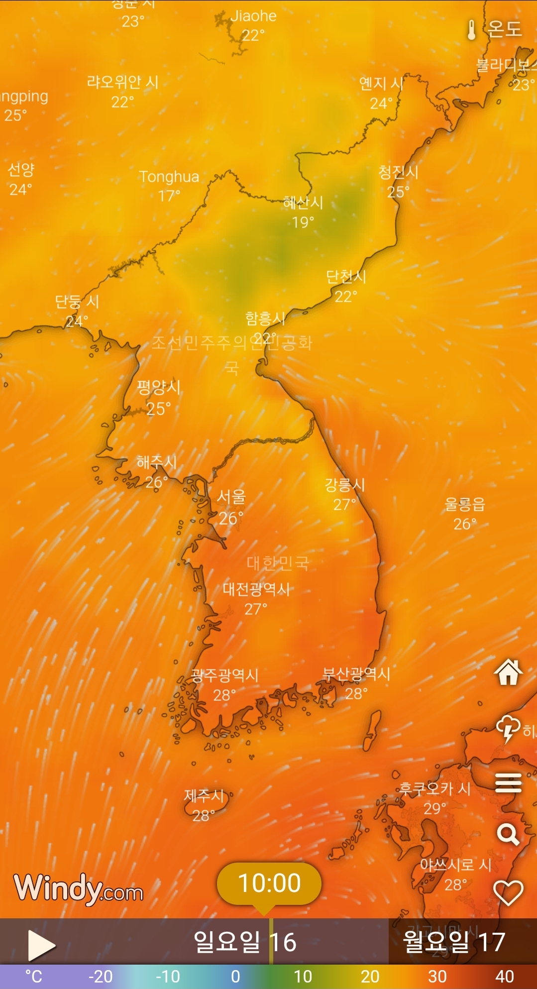 [아래사진]은 기상정보 앱 "windy"가 아침 10시기준 한반도 온도 분포 그래픽입니다. 오전 10시라 기준이라 그런지 서울온도는 26도, 광주/부산이 27도를 예보하고 있습니다. 하지만 표출된 그래픽을 보고 있으니 답답하기 그지 없습니다.