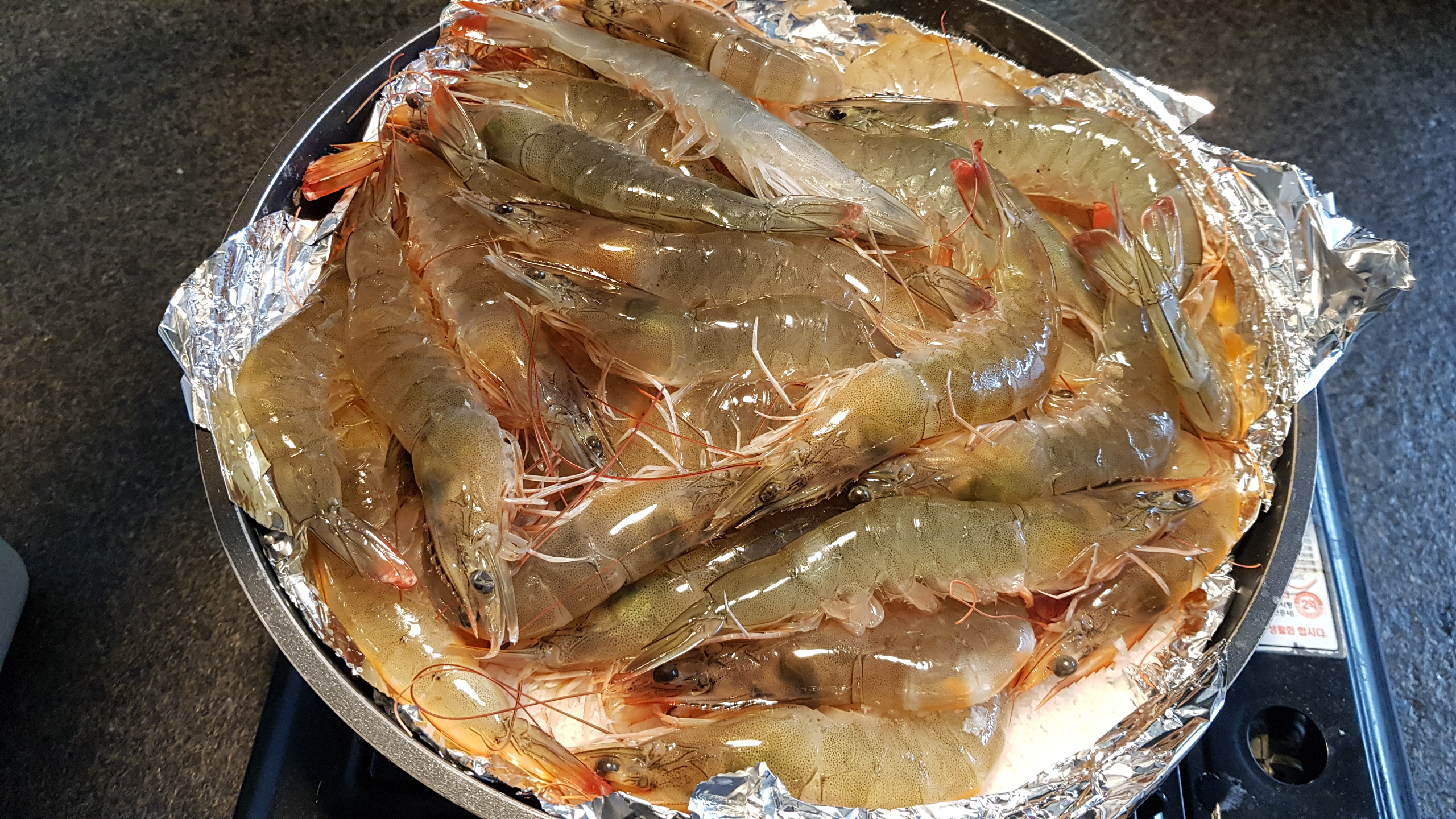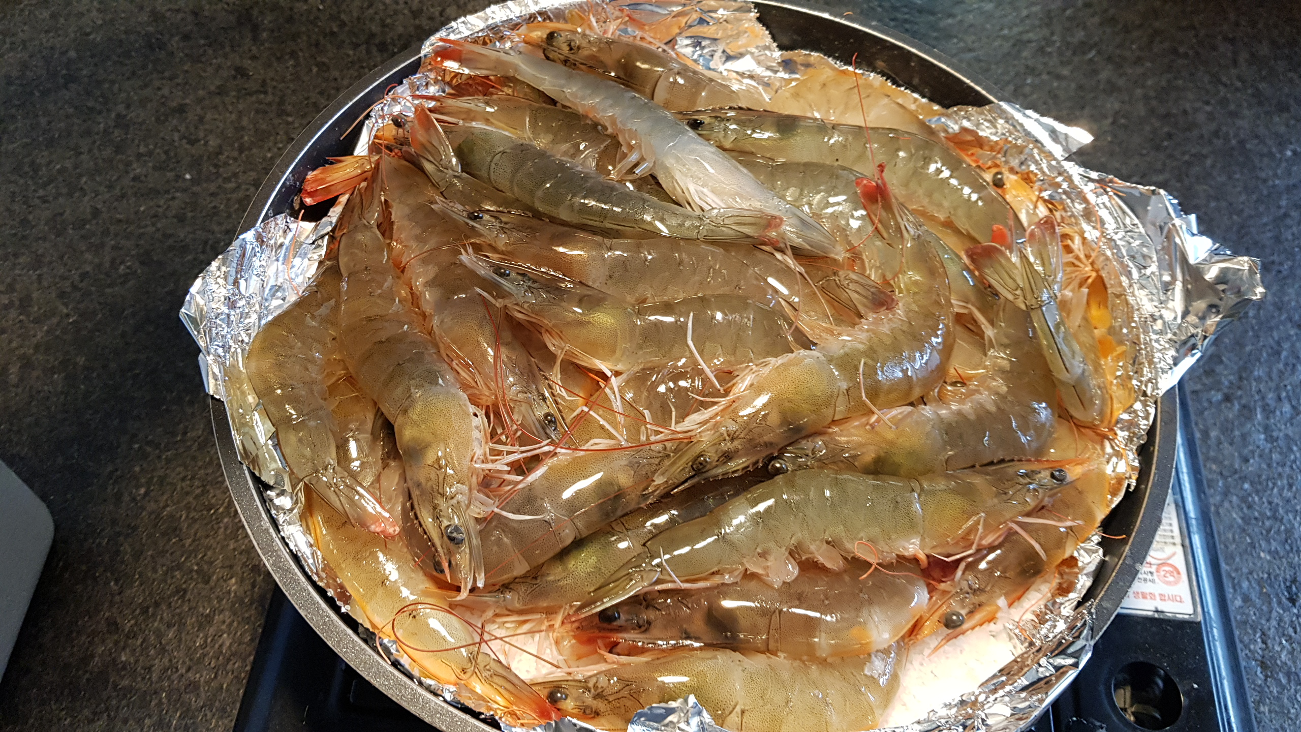 새우를 소금구이로 먹는것은 쪄 먹는 것에 비교해 후라이팬, 소금, 은박지, 가스버너 등 준비할게 많습니다. 그래서 귀찮니즘이 작용하면 그냥 쪄먹기도 하는데 탱글탱글하고 고소 달콤 식감에 있어서는 새우 소금구이를 따라올 장사가 없지요.