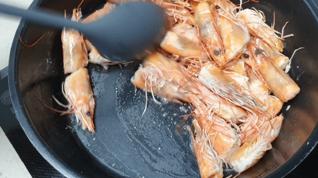 어느정도 소금에 열이 가해졌다고 판단 되면 수산시장에서 사온 새우를 이곳에 넣어줍니다. 구매한 새우 비닐 봉다리에는 물이 고여 있는데 최대한 이 물이 소금이 있는 후라이팬에 떨어지지 않도록 해주세요. 소금에 물이 들어가면 금세 소금이 굳어 버리기 떄문입니다.