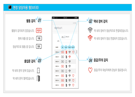 이 시스템은 댁내에서 홀로 생활하는 노인 또는 중증장애인이 스스로 응급전화를 하기 어렵더라도 장비의 다양한 감지기(센서)들이 24시간 서비스 대상자의 댁내 활동, 심박・호흡, 수면시간 등을 확인하고 화재, 낙상 등 응급상황에서 119 구호조치가 가능하도록 자동 연결합니다.