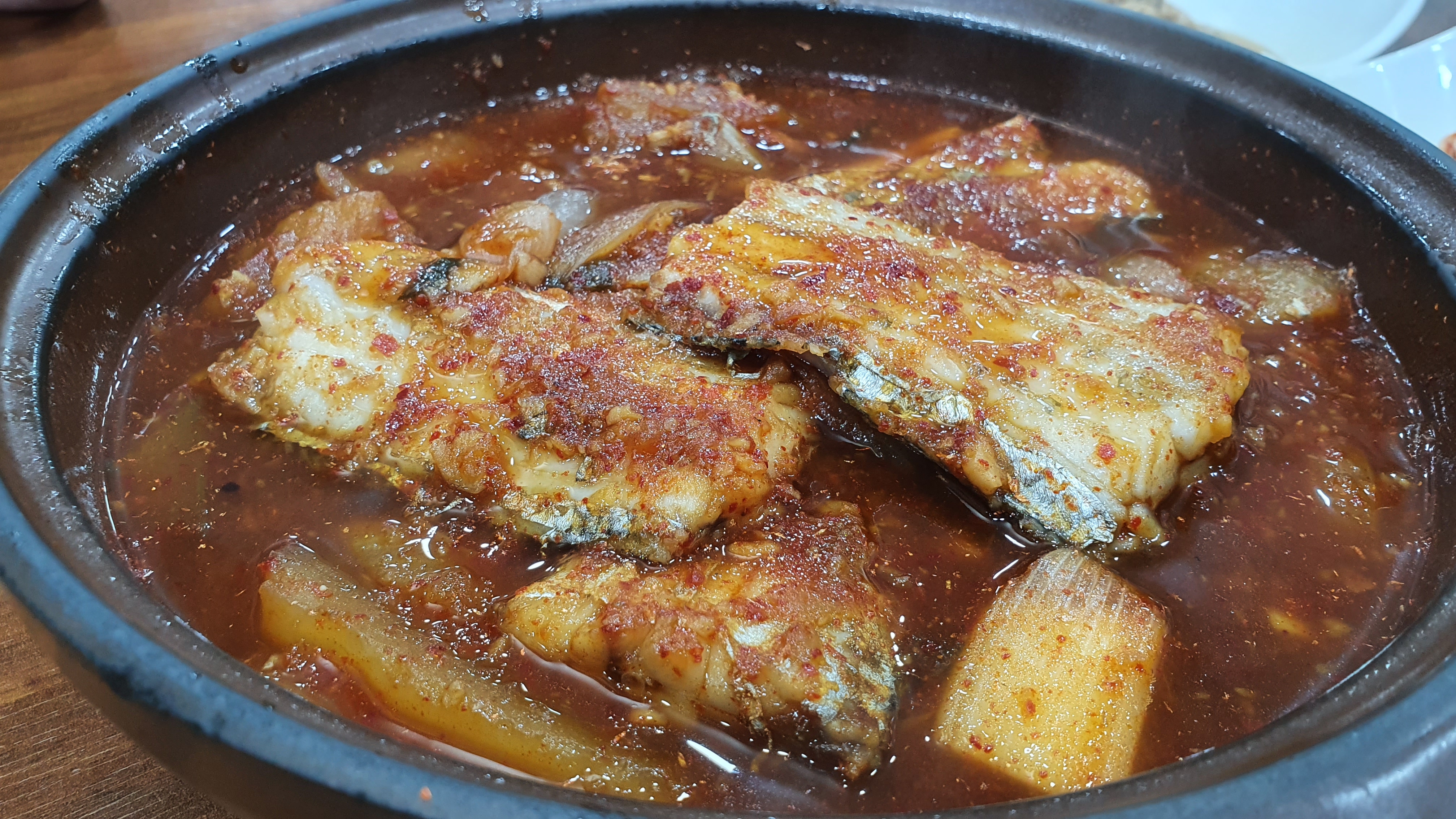 주문하고 10여분 기다리면 [아래사진]과 같이 뚝배기 비슷한 냄비에 갈치조림이 나옵니다. 조림이기에 저는 자글자글로 국물이 이 보다 적은 그런 뷰를 생각했는데... 국물이 약간 많게 느껴졌습니다. 조림 국물 첫맛은 아주 진했습니다. 무우에는 양념이 아주 맛있게 베여 이것만 가지고도 밥 한 공기는 뚝 딱 할 것 같았습니다.