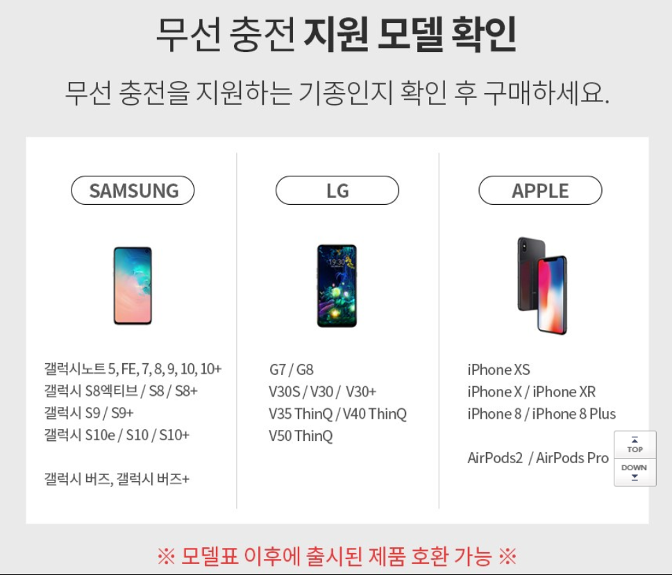 해당 스마트폰이 무선충전 지원 모델인지 확인하시기 바랍니다. [아래 사진] 참고하시기 바랍니다.