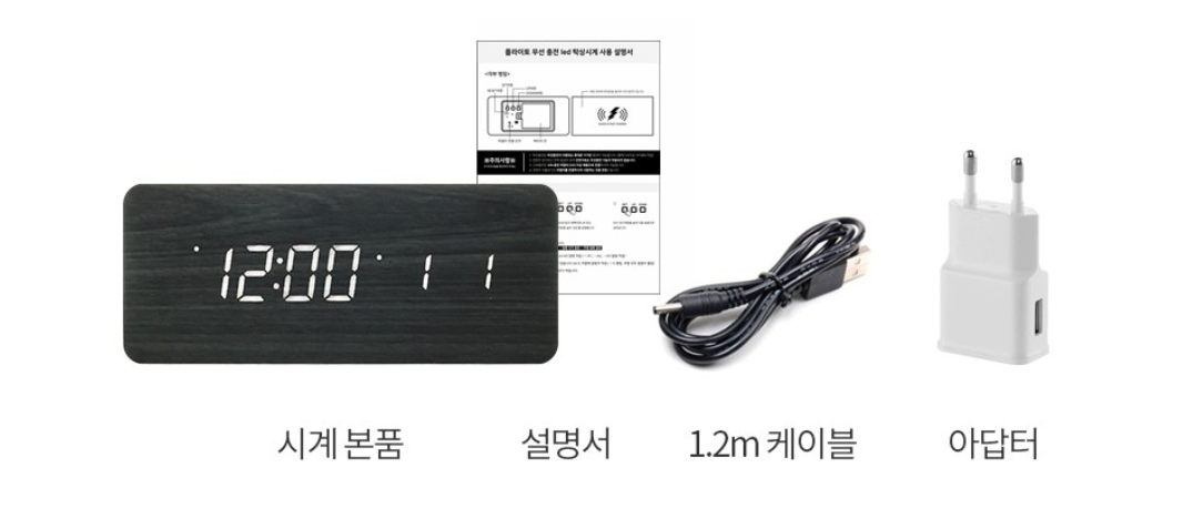 제가 찜한 LED 탁상 시계 기능은 5W 일반 무선충전, 한눈에 보이는 시간표시, 월일 날짜 표시, LED 3단계 밝기 조정입니다. 무선 충전 기능 필요 여부 고민했는데요. 일단 있는 것으로 구매했습니다.