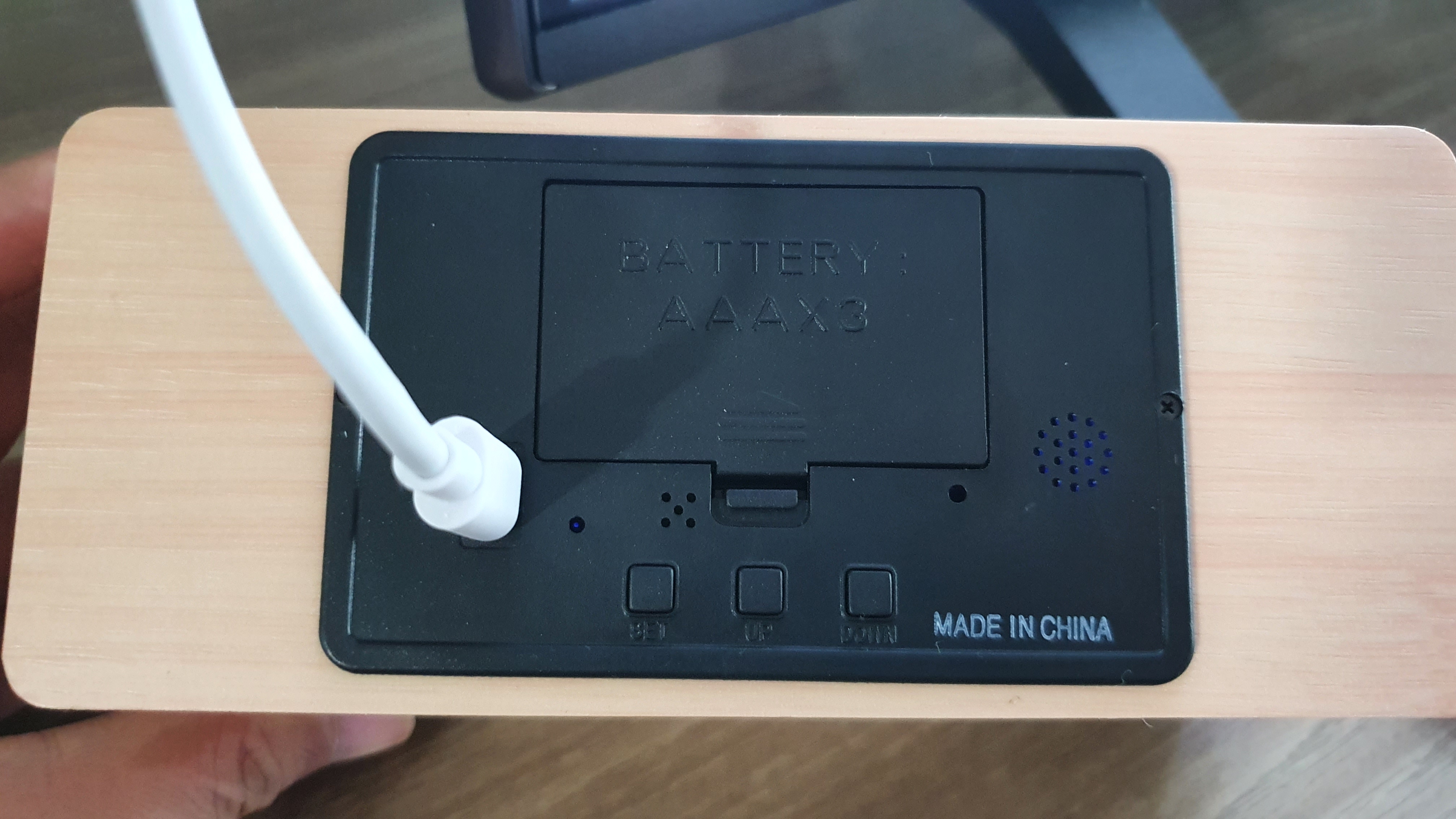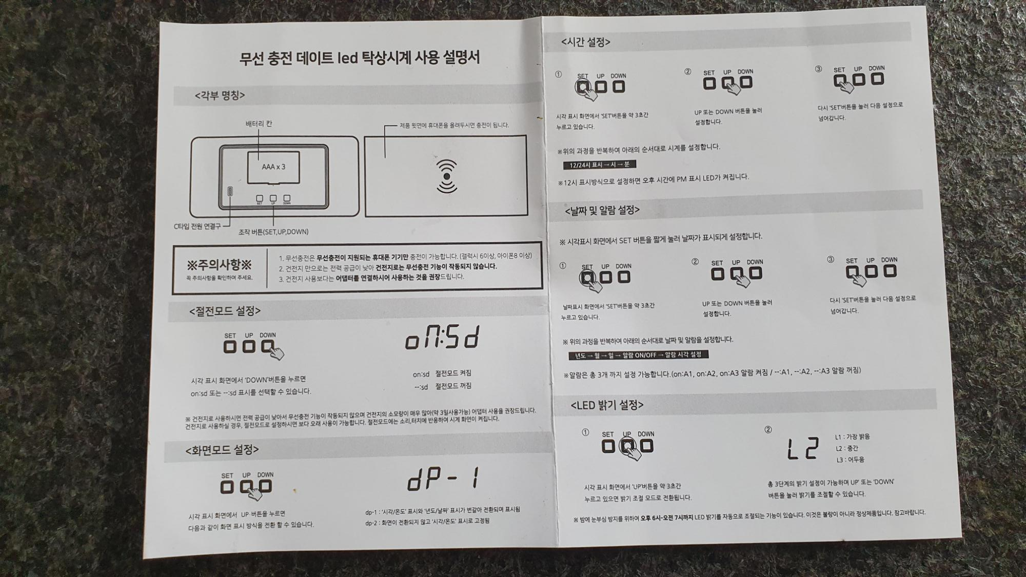 설정 모드는 절전모드, 화면 모드, 시간 설정, 날짜 및 알람 설정, LED 밝기 설정 등 5개이네요. 누르는 버튼은 본체 뒷면에 있어요. 저는 누르는 것보다 글씨 작아서 그것을 해독하는 것이 더 어려웠어요. ㅋㅋㅋ.