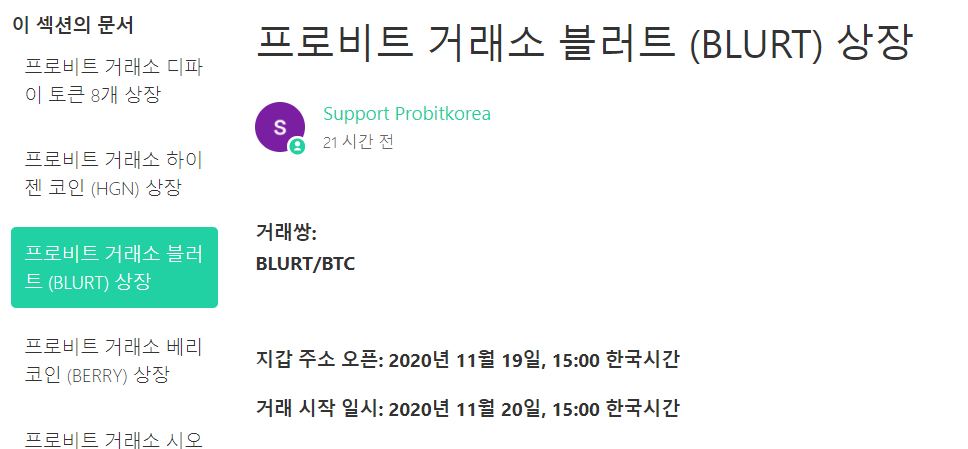 암호 화폐 거래소 프로비트는 지갑 주소는 2020년 11월 19일 오후 3시 오픈했습니다. 20일 아침 저는 블러트 홈에서 거래소 프로비트로 소량 송금했는데 정상적으로 처리가 되었습니다. 거래는 20일인 오늘 오후 3시부터 이뤄질 예정입니다.