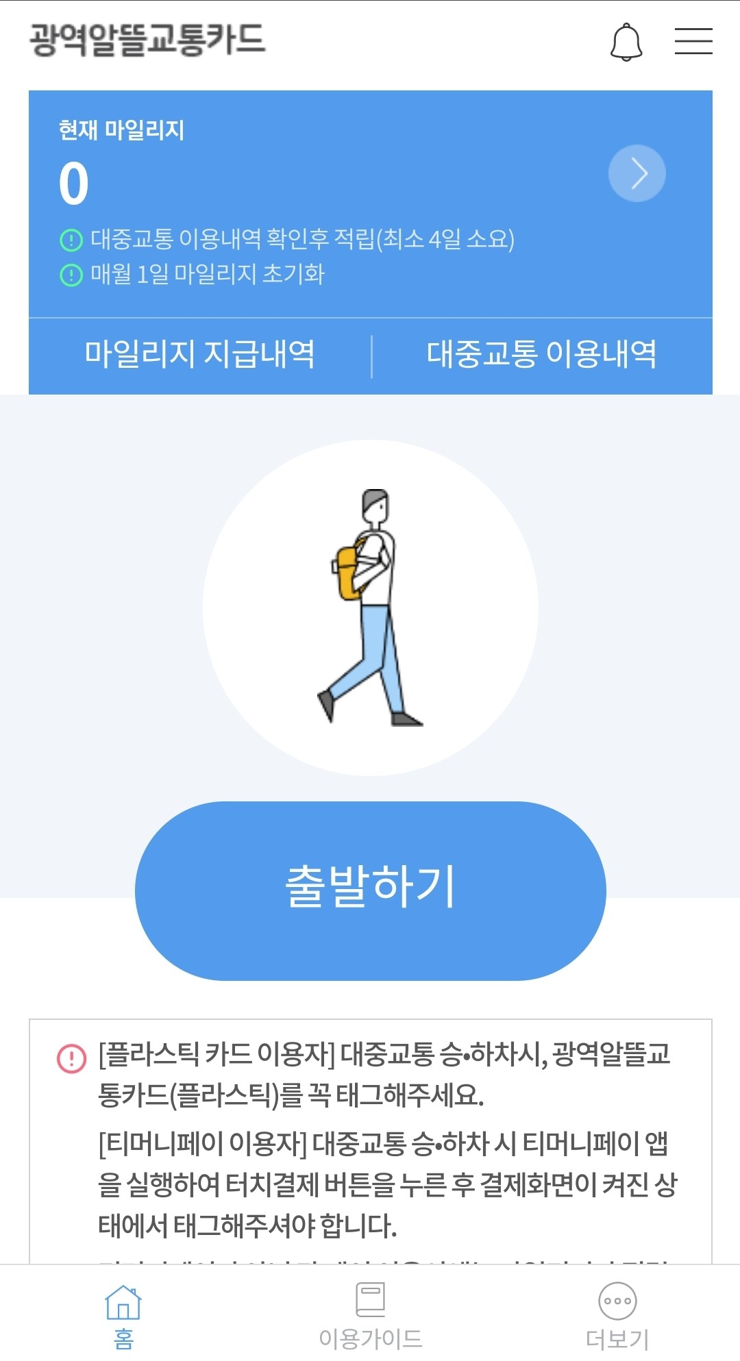 - 대중교통 이용 전·후로 ‘광역알뜰교통카드’ 앱을 실행하고 보행/자전거로 이동하면, 추가로 최대 20% 마일리지를 적립받을 수 있습니다. [아래사진]이 광역알뜰교통카드 앱 메인 화면입니다.