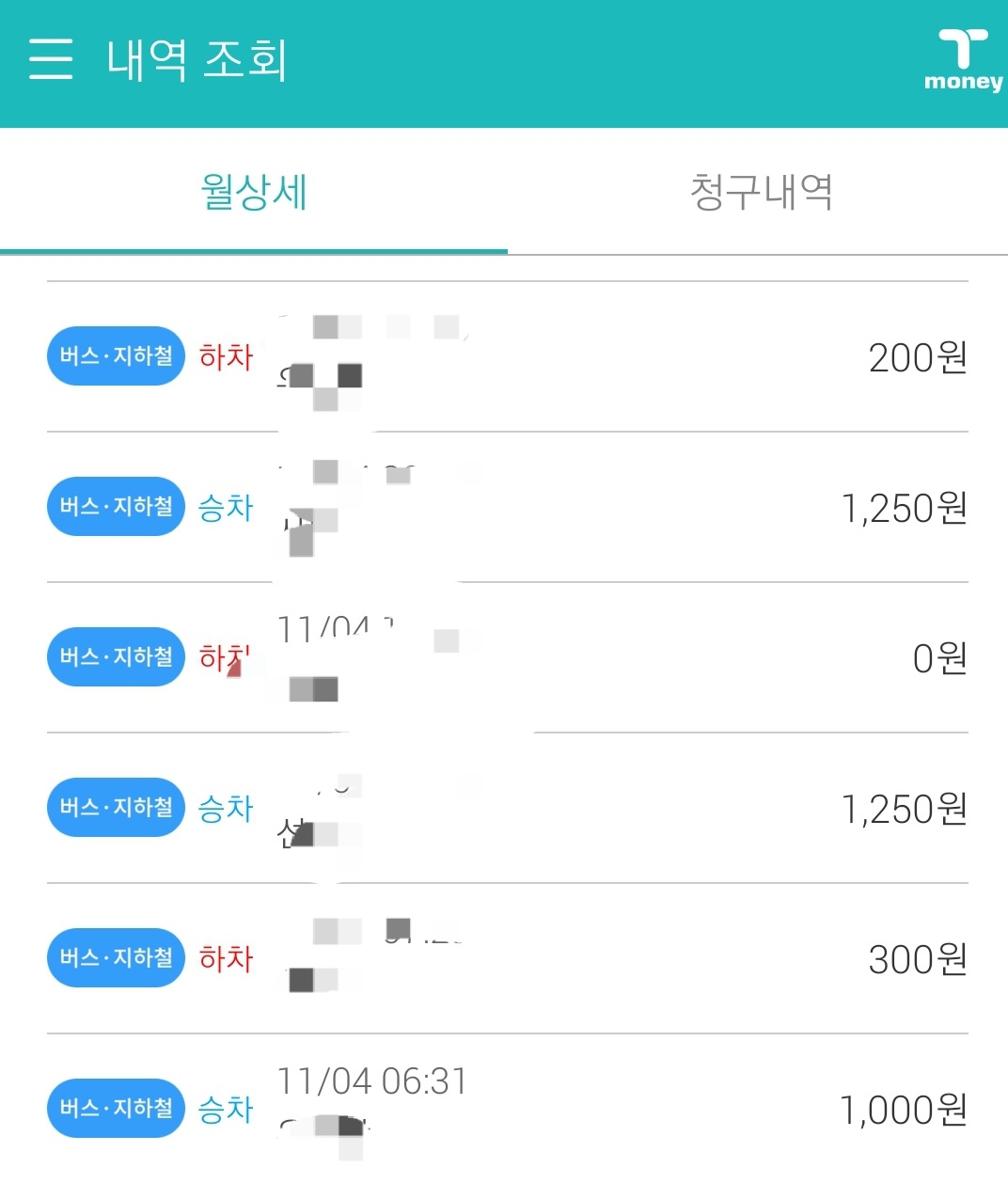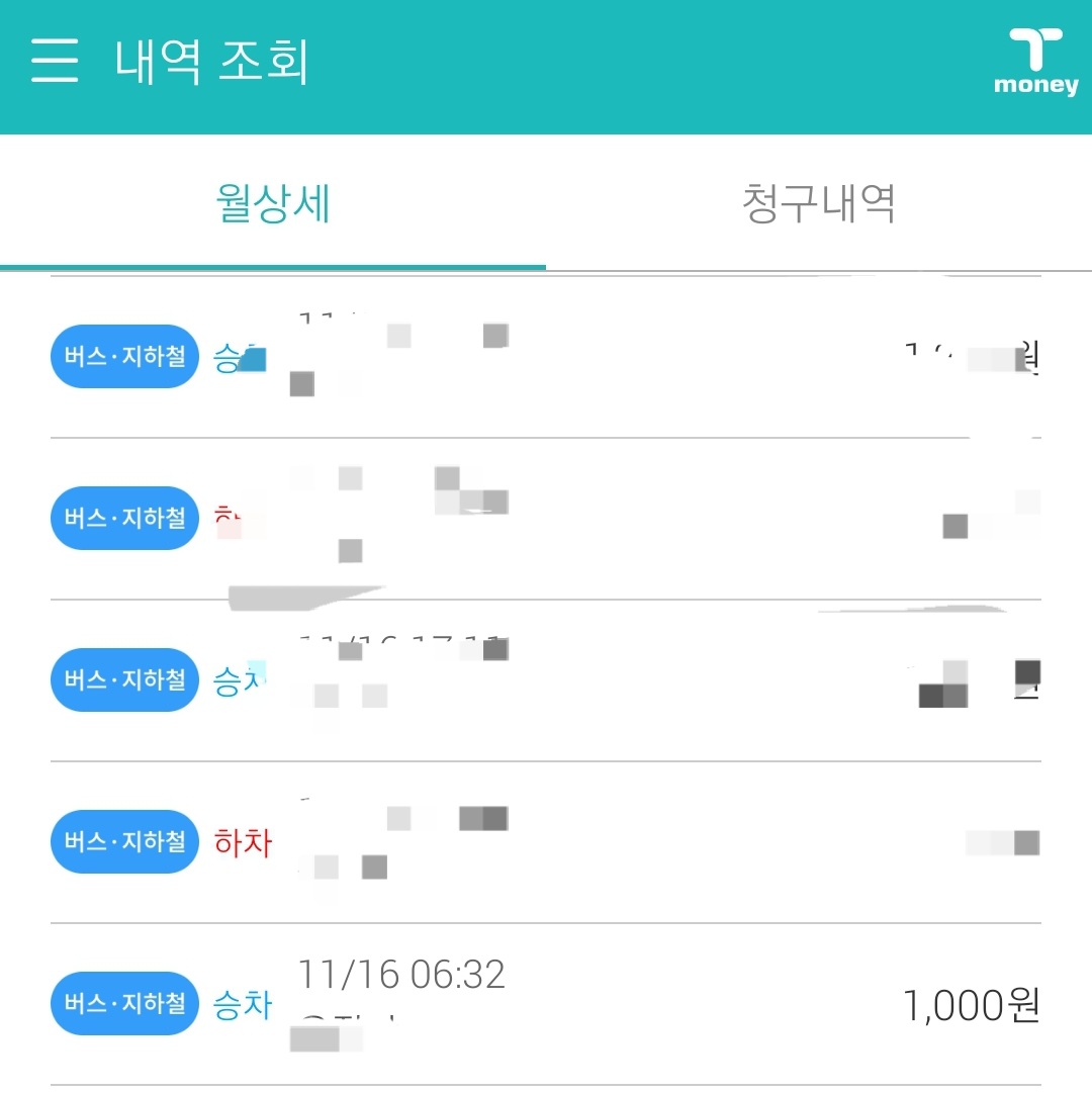 그런데 6시 30분 약간 넘는 시간에 또 한 번 게이트를 통과하는데 이때도 1,000원만 차감되더군요. 그래서 내역을 조회했습니다. 그랬더니 정말로 서울 매트로에서 공지한 시간과 다르게 아침 6시 30분이 넘어도 할인율이 적용된 것을 확인했습니다.