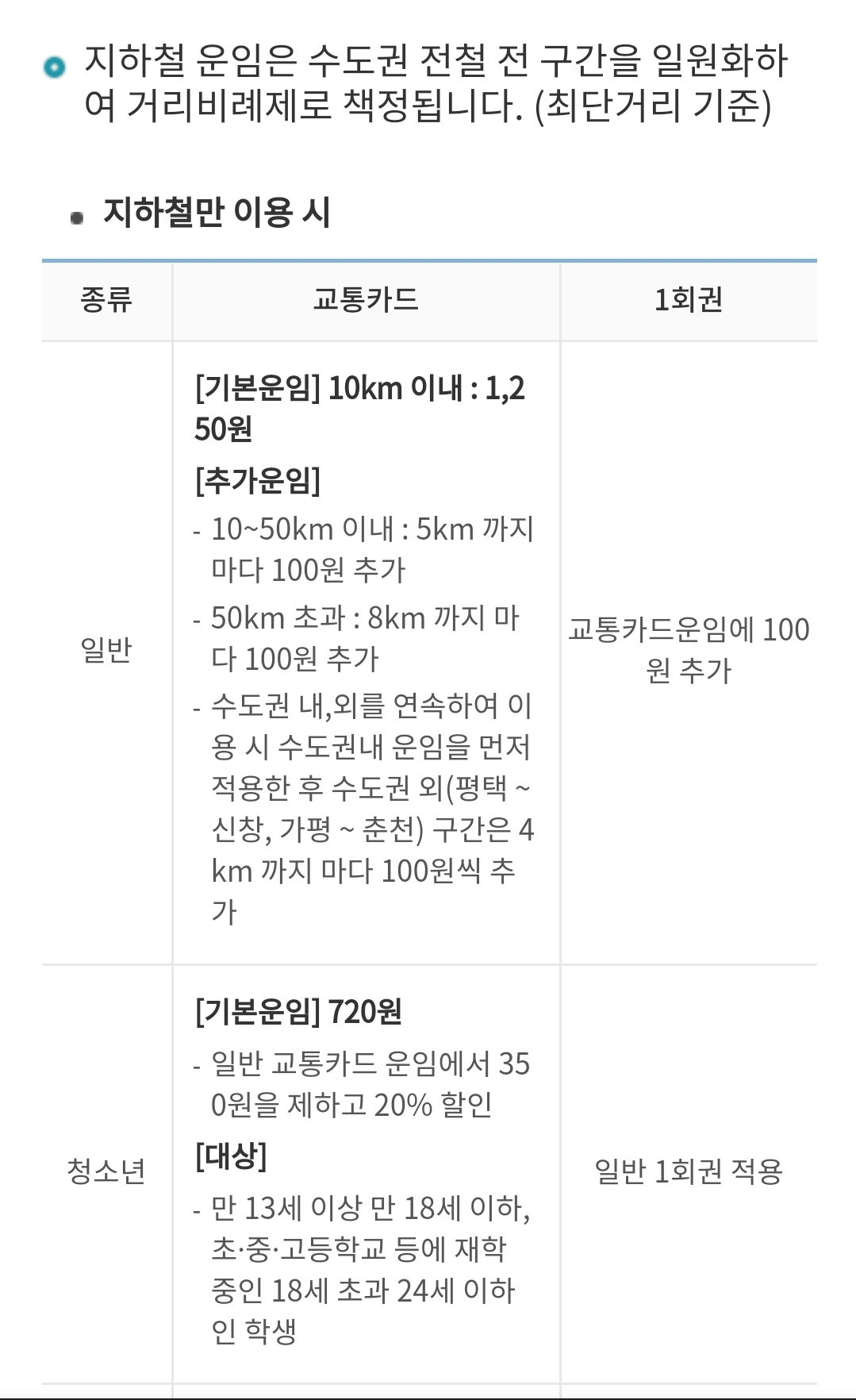 서울 매트로 자료에 따르면 "지하철 운임은 수도권 전철 전 구간을 일원화하여 거리비례제로 책정됩니다."라고 하면서 기본운임은 10km이내 1,250원(교통카드 기준)으로 [아래 사진]과 같이 책정되어 있습니다. 청소년은 720원이고요.