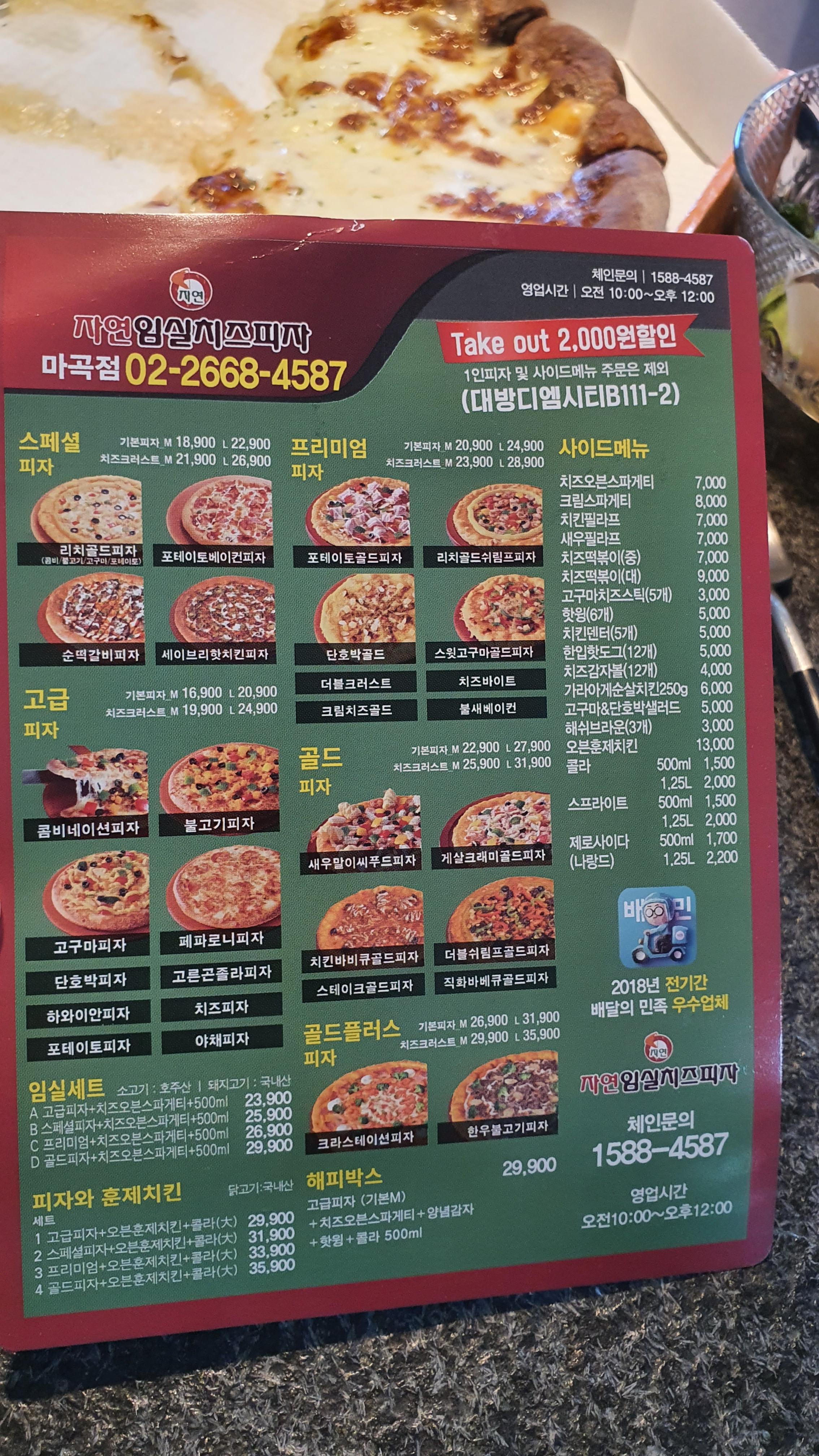 주문한 피자 포장지 겉면에 [아래사진]과 같은 자연 임실치즈피자 메뉴 전단지가 있더군요. 피자 주문은 스마트폰으로 다 처리했지만 이렇게 전단지를 보니 메뉴가 한눈에 들어와 보기 좋더군요. 우리는 이 메뉴 중에서 "리치골드 피자"와 "치즈피자"를 주문했습니다.