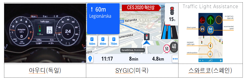 아우디는 Traffic Light Information with GLOSA(Green Light Optimized Speed Advisory)란 프로젝트로 교통신호기반 최적 속도 안내 서비스를 미국 등 16개 도시, 10,000개 교차로에서 시행합니다. 또 SYGIC는 미국 주요 13개 도시에서 13,000개 교차로를 대상으로 한 신호정보 서비스(Traffic Lights for Sygic GPS Navigation)로 CES 2020에서 혁신상 수상했습니다. 스와로코는 신호기 판매와 연계 교통신호 개방 플랫폼 동시 판매합니다.
