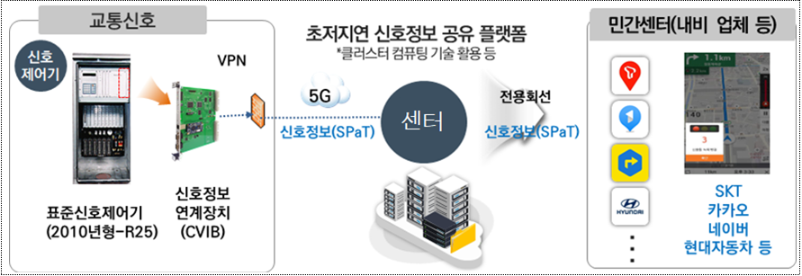 시는 데이터 개방을 위해 "5G 통신망 등을 활용하여 0.1초(100ms) 단위로 데이터를 수집하고, 0.1(100ms) 초 이내 모든 데이터가 상호 교환되는 초저지연 개방 플랫폼을 구현하였다."라고 하면서 "교통신호 데이터 등은 1초라도 시간 지연이 발생 경우에는 이미 과거의 데이터로 가치가 없어지기 때문에 초저지연 데이터 교환은 자율주행 등 미래 교통산업의 핵심기술로 인식되고 있다."라고 하더군요.