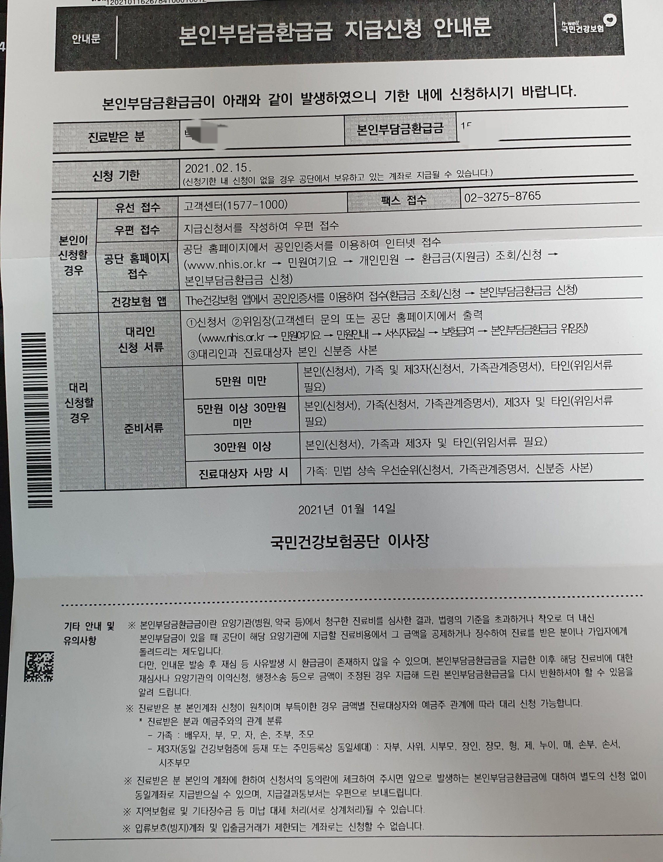 이런 앱이 있다는 것을 최근에 알았어요. 그 배경은 <국민건강보험공단>에서 [아래 사진]과 같이 "본인부담금 환급금 지급신청 안내문"이 우편으로 왔는데요. 읽어보니 환급금을 신청하라는 내용이더군요. 그리고 환급금 신청방법에 유선, 우편접수, 공단 홈페이지 접수, 건강보험 앱이 있더군요. 그래서 이 앱을 처음으로 스마트폰에 설치했답니다.