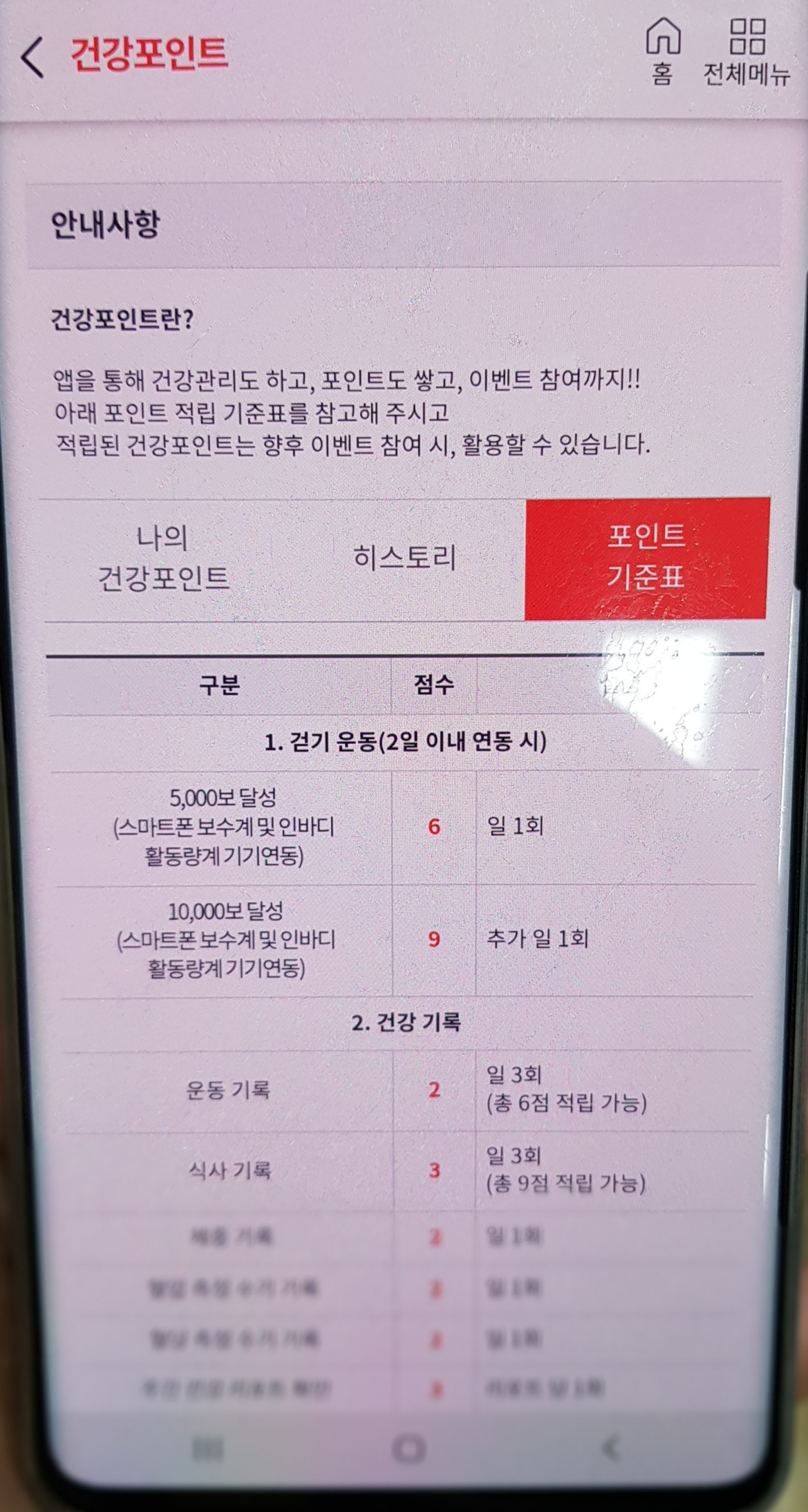 포인트 기준표에 따르면 5,000보 달성시 일 1회 6점, 1만보 달성시 추가로 9점을 주도록 되어 있네요. 그리고 건강기록에 대한 포인트도 있습니다. 운동기록은 2점, 식사 기록은 3점 등등입니다.