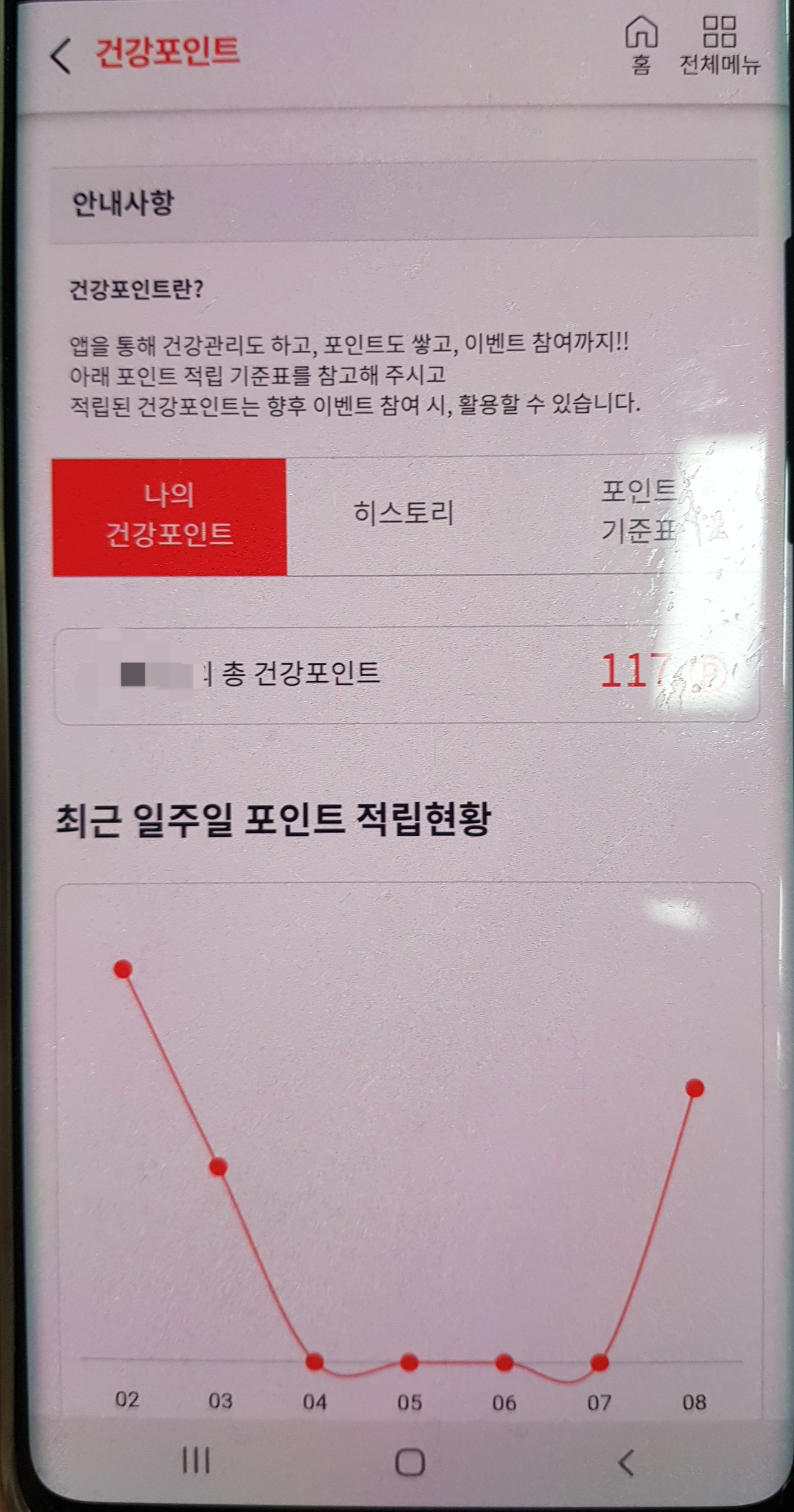 저의 건강 포인트는 [아래사진]과 같이 누적으로 117p가 모아졌네요. 최근 일주일 포인트 적립현황에서 4, 5, 6, 7일이 포인트가 0으로 나오는데, 사실 이날도 1만 보 다 채웠는데 삼성 헬스 연동에 에러가 발생한 것으로 보입니다.