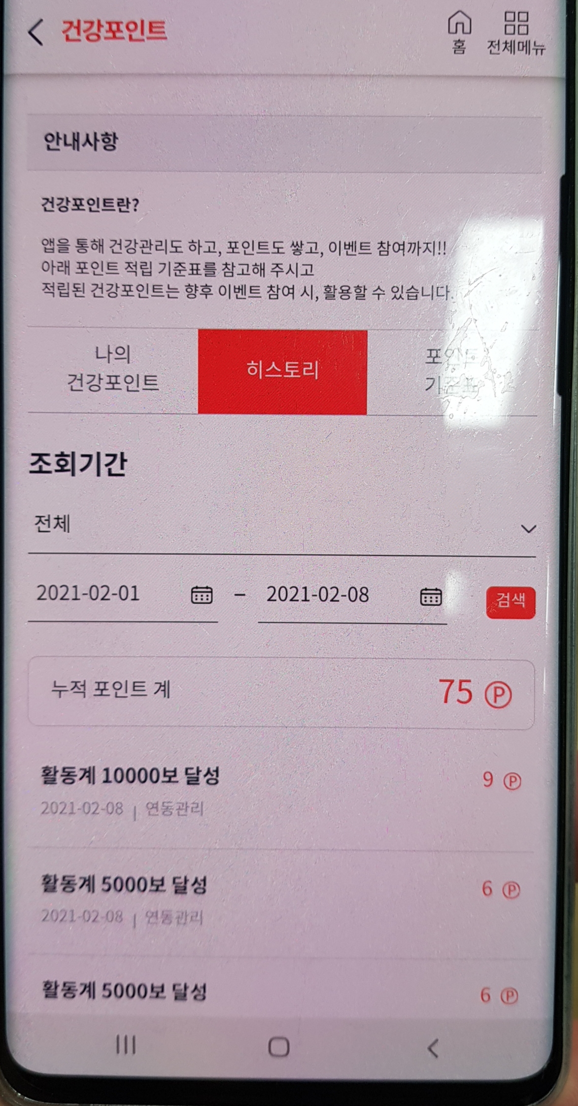 [아래사진]은 지난 2월 1일부터 2월 8일까지 포인트 히스토리입니다. 5 천보 걸으면 6점, 1만 보 달성하면 추가로 9점을 주네요. 이 점수는 포인트 기준표에 따라 지급이 되고 있습니다.