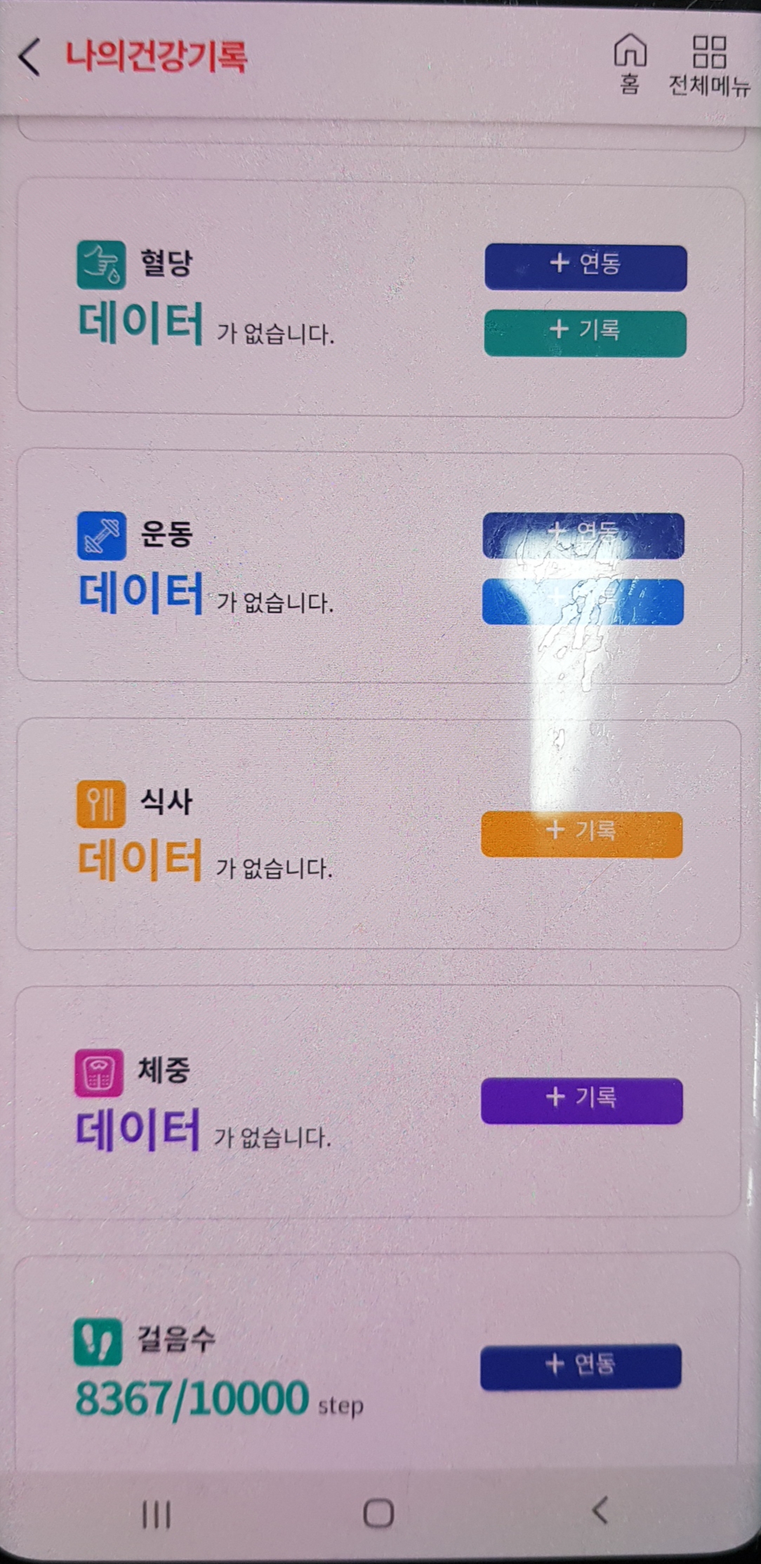 삼성 헬스, 인바디, 혈당계, 혈압계 등과의 연동은 [아래화면]에서 "나의 건강기록"에서 할 수 있습니다.