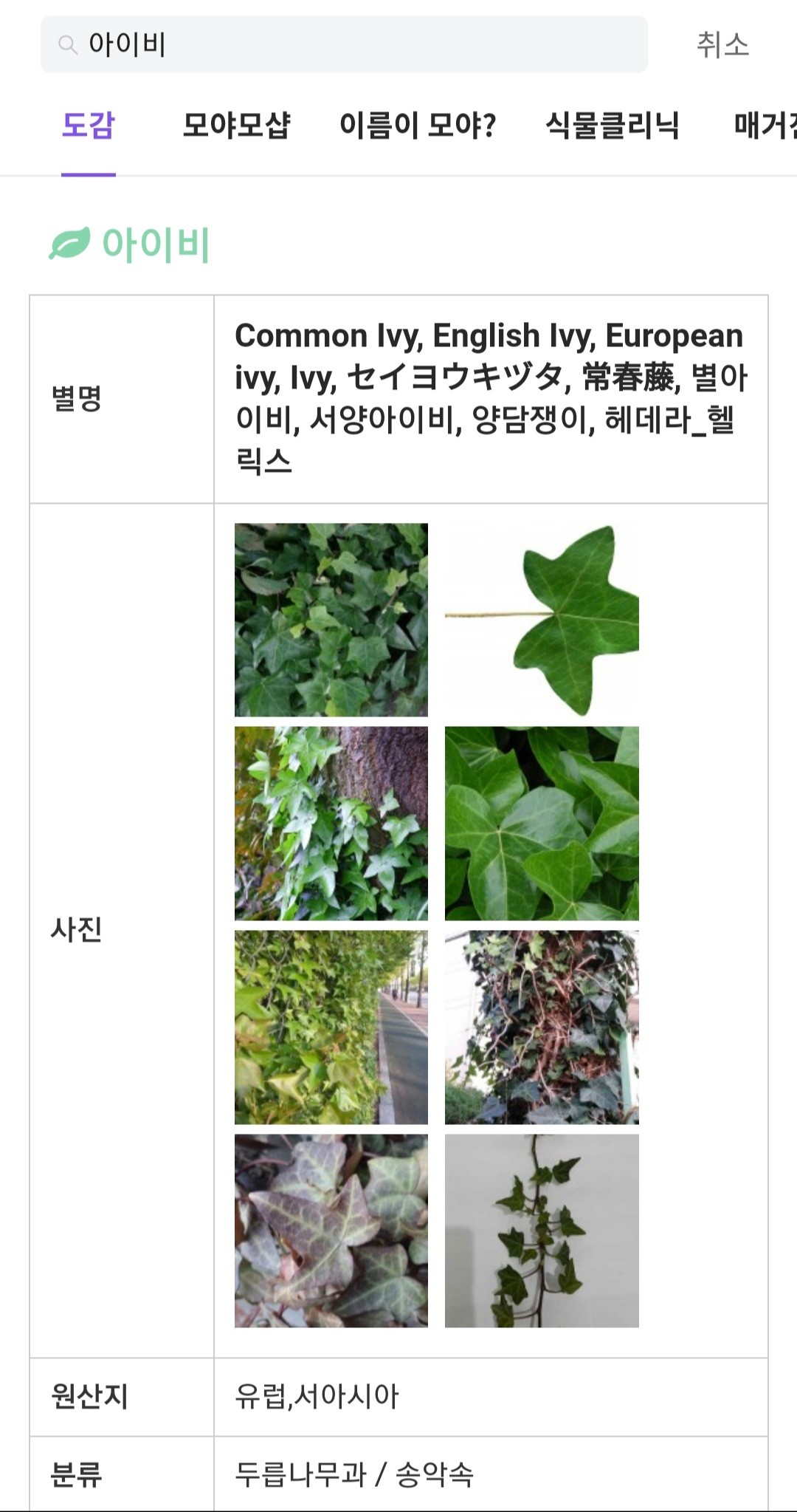"아이비"라고 모야모 어플이 알려준 답변을 누르면 [아래 사진]과 같이 식물도감으로 바로 이동합니다.