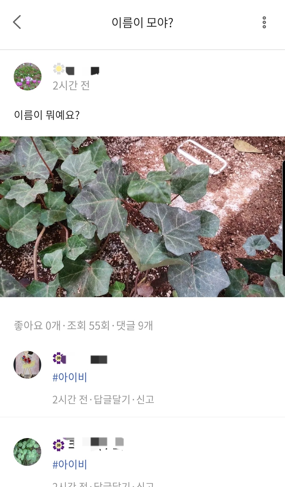 모르는 이 식물 사진을 업로드하니 곧바로 꽃 이름과 식물이름 알려주는 어플 "모야모"에서 알림이 울립니다. 모야모 어플을 열어서 확인하니 이 식물 이름은 아래 사진과 같이 "아이비"라고 알려 주네요.