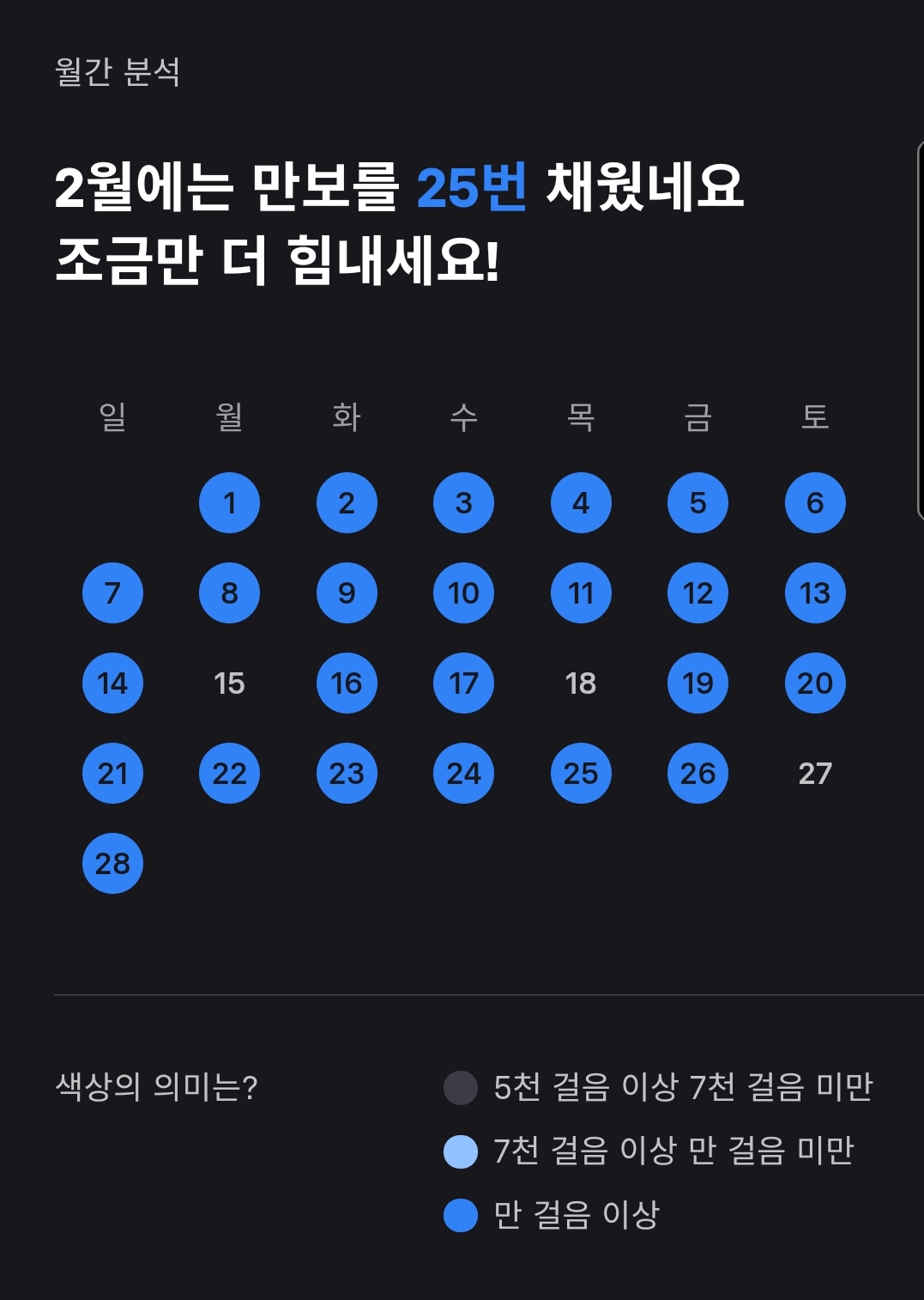 [아래 사진]은 2월 월간 분석 자료입니다. 어플 "토스"에 있는 만보기는 "2월에는 만보를 25번 채웠네요. 조금만 더 힘내세요!"라고 힘을 주고 있습니다. 아쉽게도 28일 중 3일 만보 놓쳤어요.
