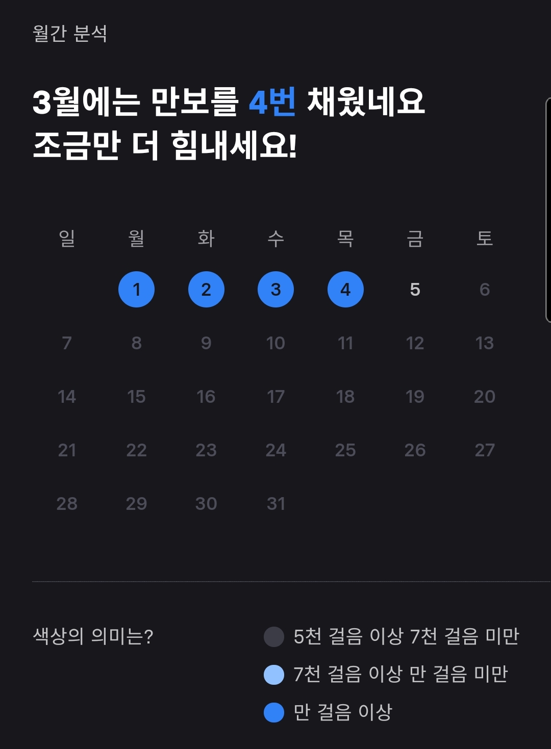 3월은 4일 저녁 기준으로 1만 보 걷기가 순조롭게 진행 중입니다. 이번 달은 31번 1만보를 꽉 채워보려고 합니다.
