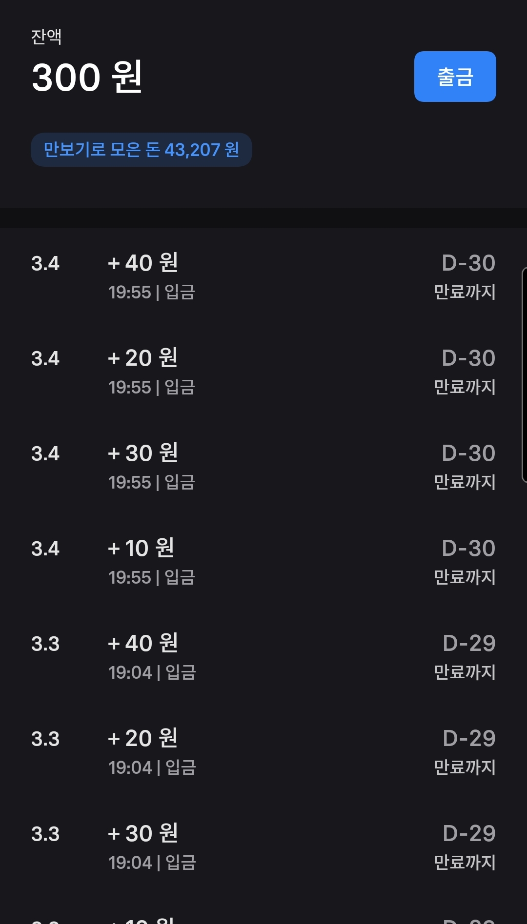 지금까지 토스 만보기로 모은 돈은 4만 3207원입니다. 기간은 1년 반은 된 것 같네요. 스타벅스 아메리카노 10잔 정도는 마실수 있겠어요.