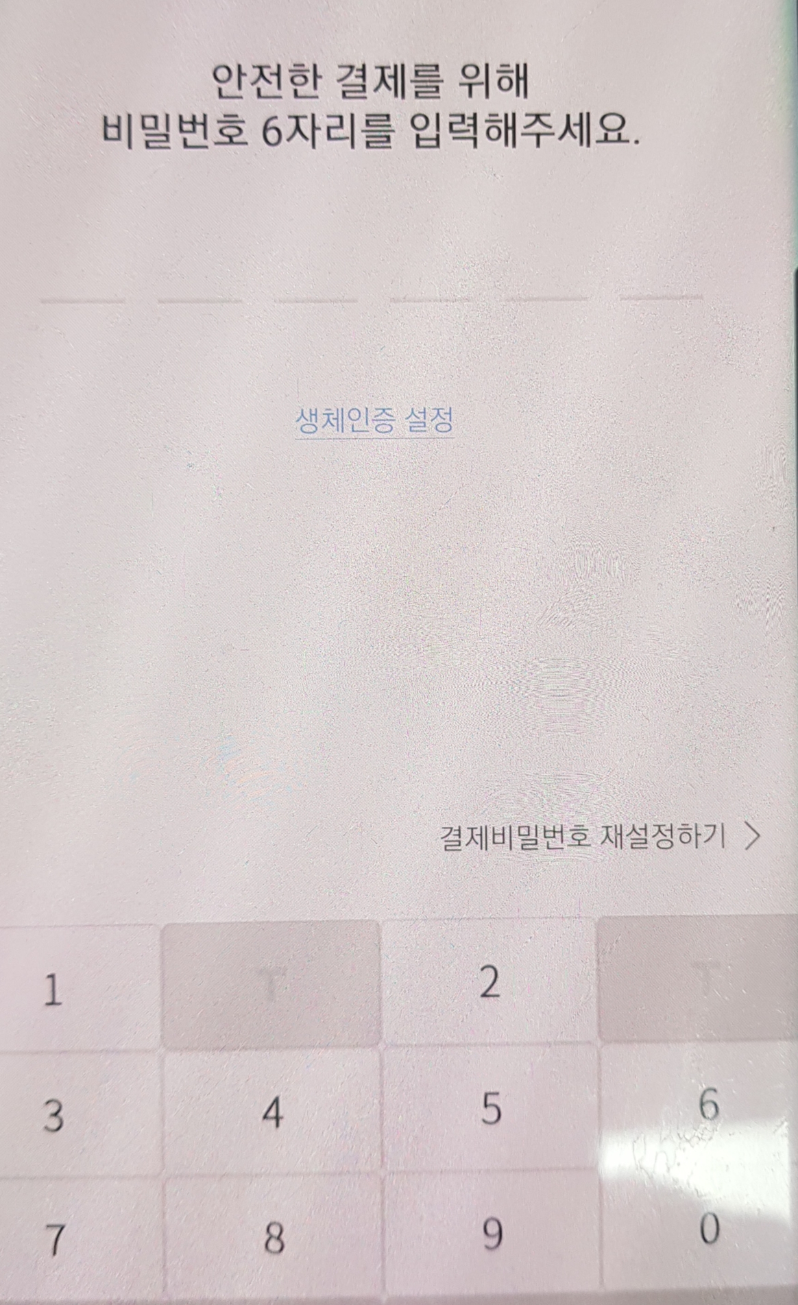 티머니 페이로 제로페이 진입하면 꼭 "안전한 결제를 위해 비밀번호 6자리를 입력해주세요."라고 [아래사진]과 같은 메시지가 있었지요. 이거 지문인식 등 생체인식 보안 기능에 익숙한 사람들은 꽤나 불편했습니다.