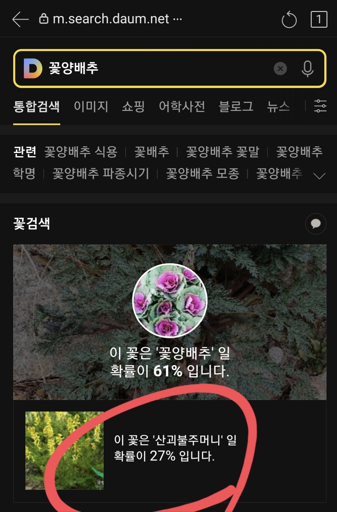 [아래 사진]과 같이 "이 꽃은 "꽃양배추"일 확률이 61%입니다."라는 결과를 알려주네요. 그러면서 이 어플은 2순위로 "이 꽃은 "산괴불주머니"일 확률이 27%입니다."라고 덧붙였습니다.