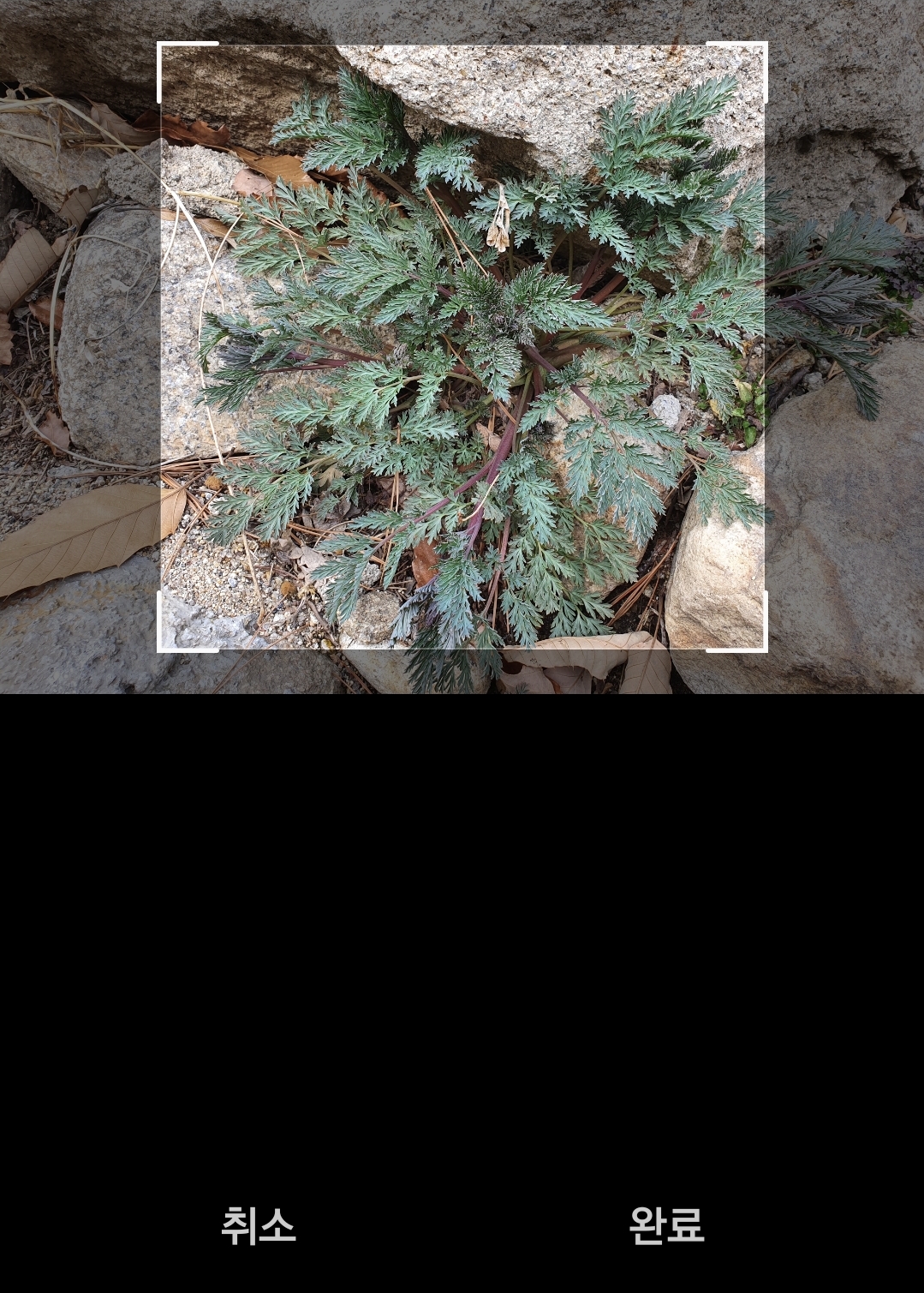 [아래 사진]은 갤러리에 있는 사진을 선택한 화면입니다. 사각형을 물어보고자 하는 식물 사진이 잘 표현될 수 있도록 조정을 잘하시고 그게 끝나면 화면 하단에 있는 "완료"를 누르면 됩니다.