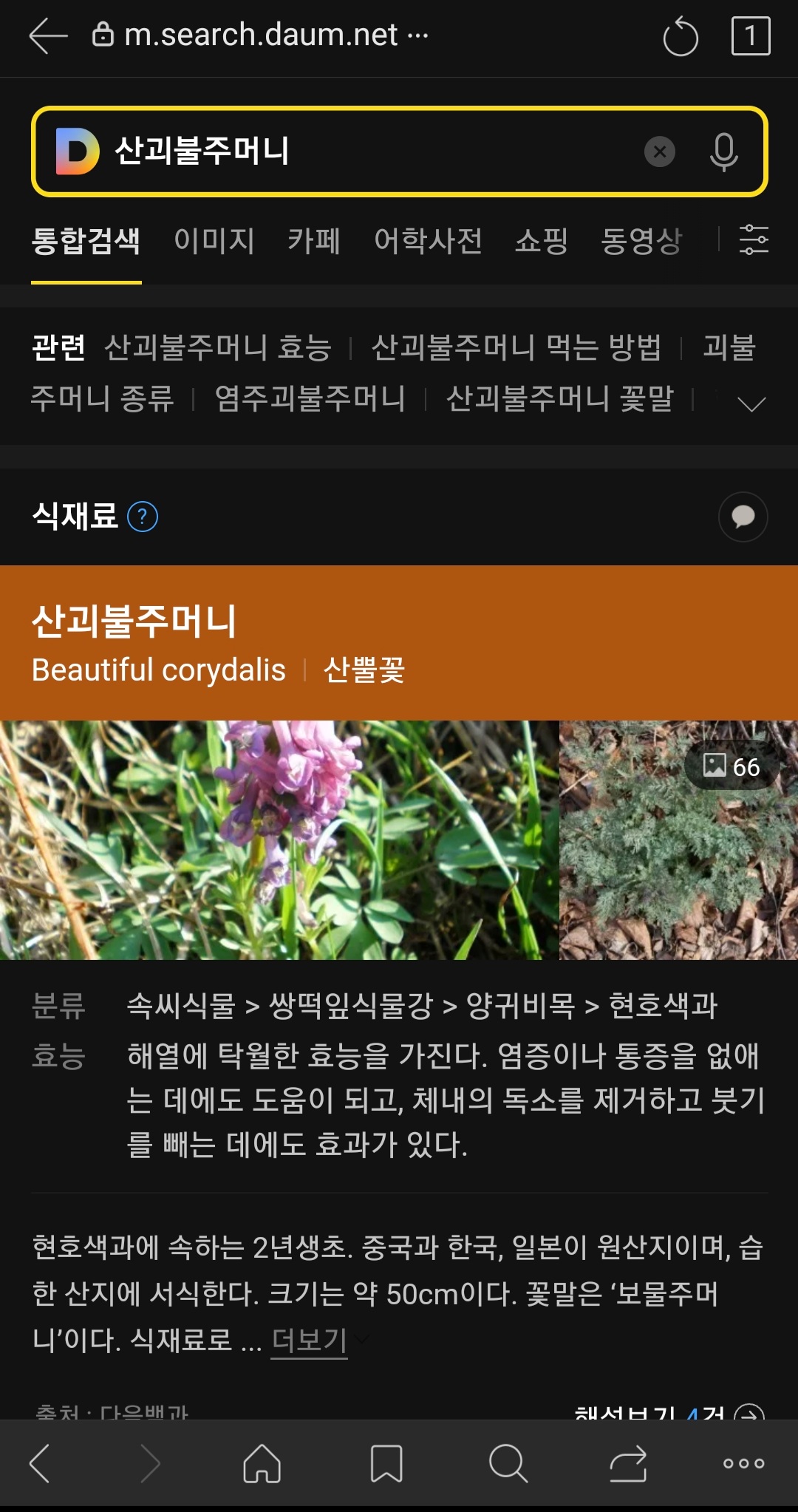 제가 볼 때는 꽃양배추보다는 "산괴불주머니"가 맞는 것 같은데요. 이럴 때 저는 "모야모" 또는 "구글렌즈" 등에 다시 한번 물어봅니다. 저는 꽃 이름, 나무이름, 식물이름 등을 아려주는 어플 "모야모"에게 다시 물었습니다. 그랬더니 이 앱은 "산괴불주머니"라고 알려주더군요. 그래서 다음 꽃 검색과 모야모의 공통분모가 되는 "산괴불주머니"로 이 식물이름을 기억하기로 했습니다.